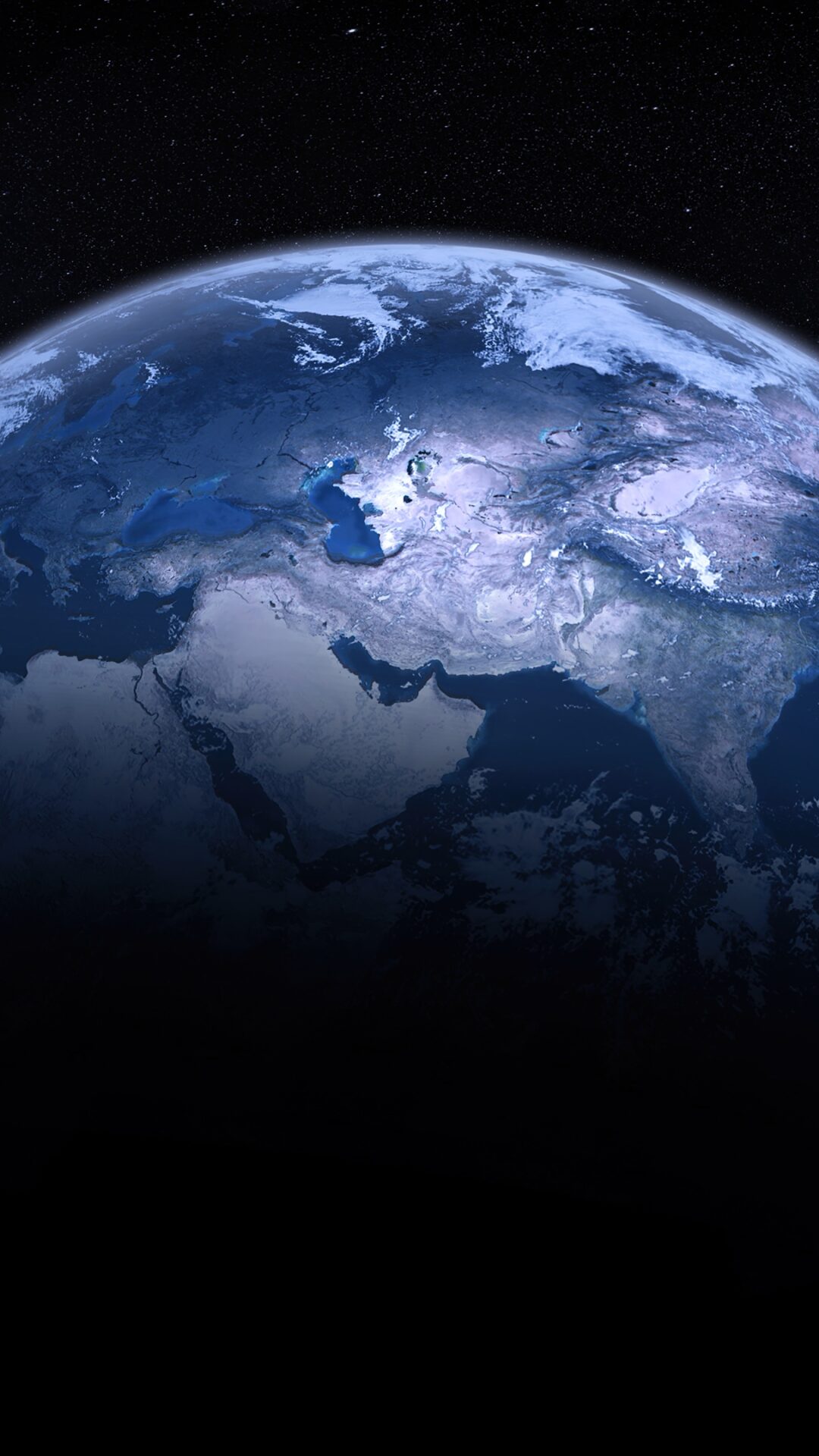 A full view of Earth is centered with Europe and Asia visible, set against a dark starry background. Soft, low-contrast lighting highlights …