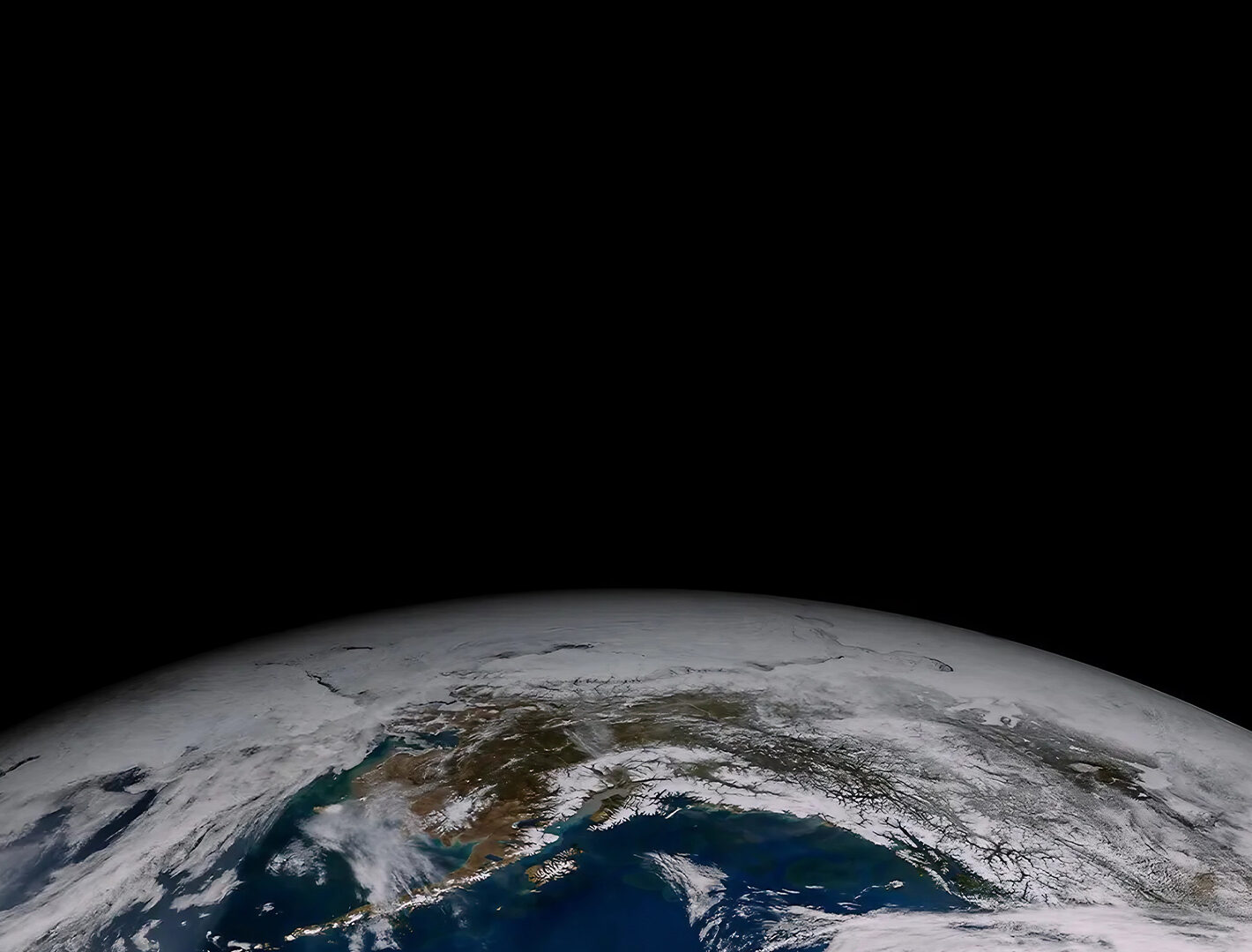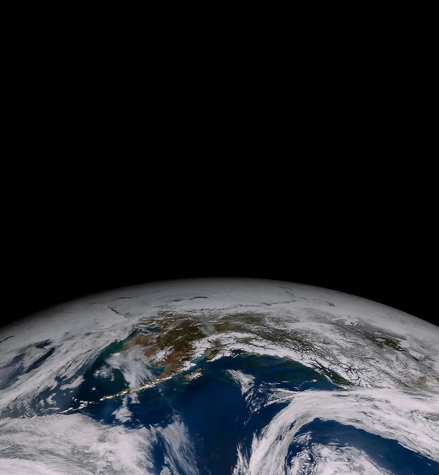 A view of Earth from space shows continents and swirling cloud formations. The dark upper portion creates a strong contrast with the blue an…