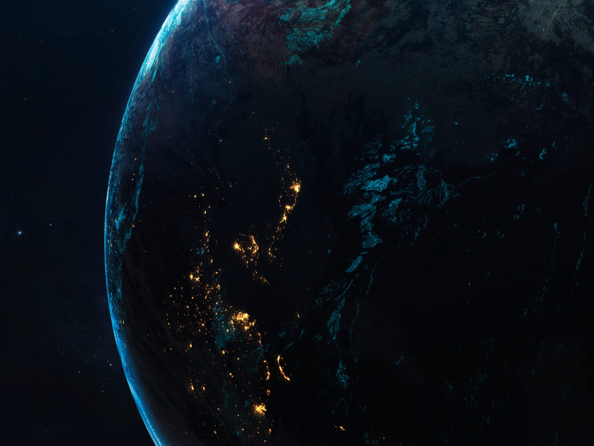 A partial view of Earth from space shows city lights clustered on the dark surface. The atmosphere has a thin, bright blue edge contrasting …