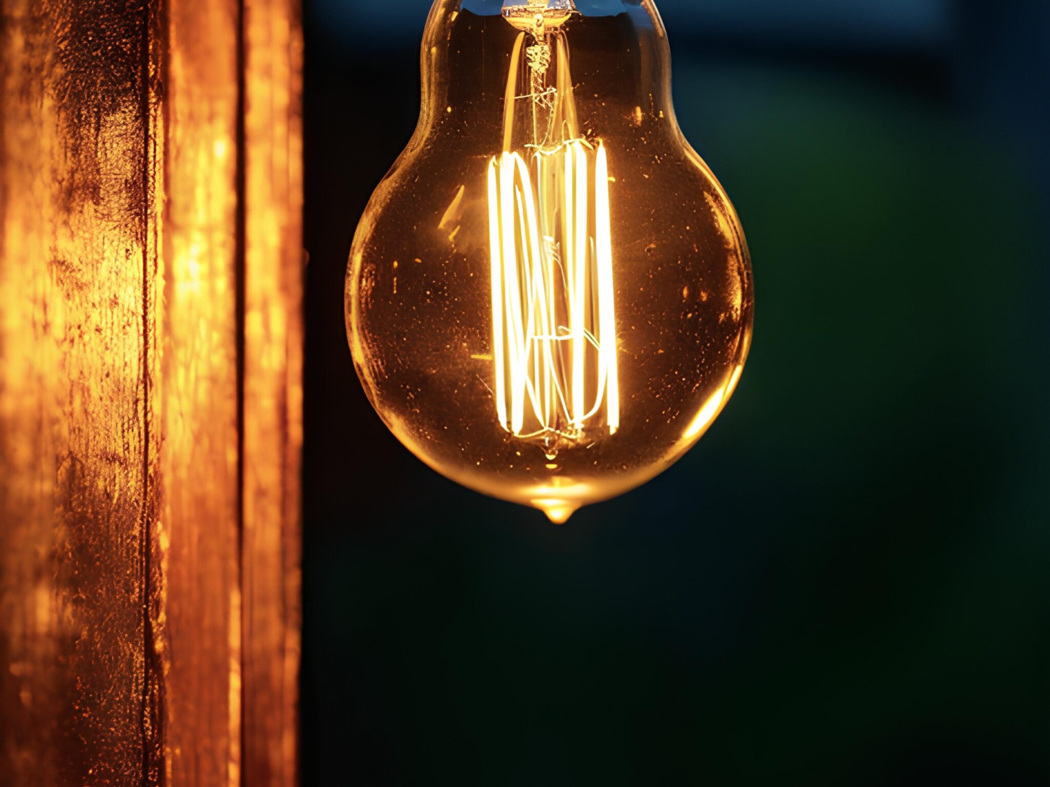 A single Edison bulb hangs in front of a blurred outdoor background. Warm, glowing filaments contrast with the dark tones of the surrounding…
