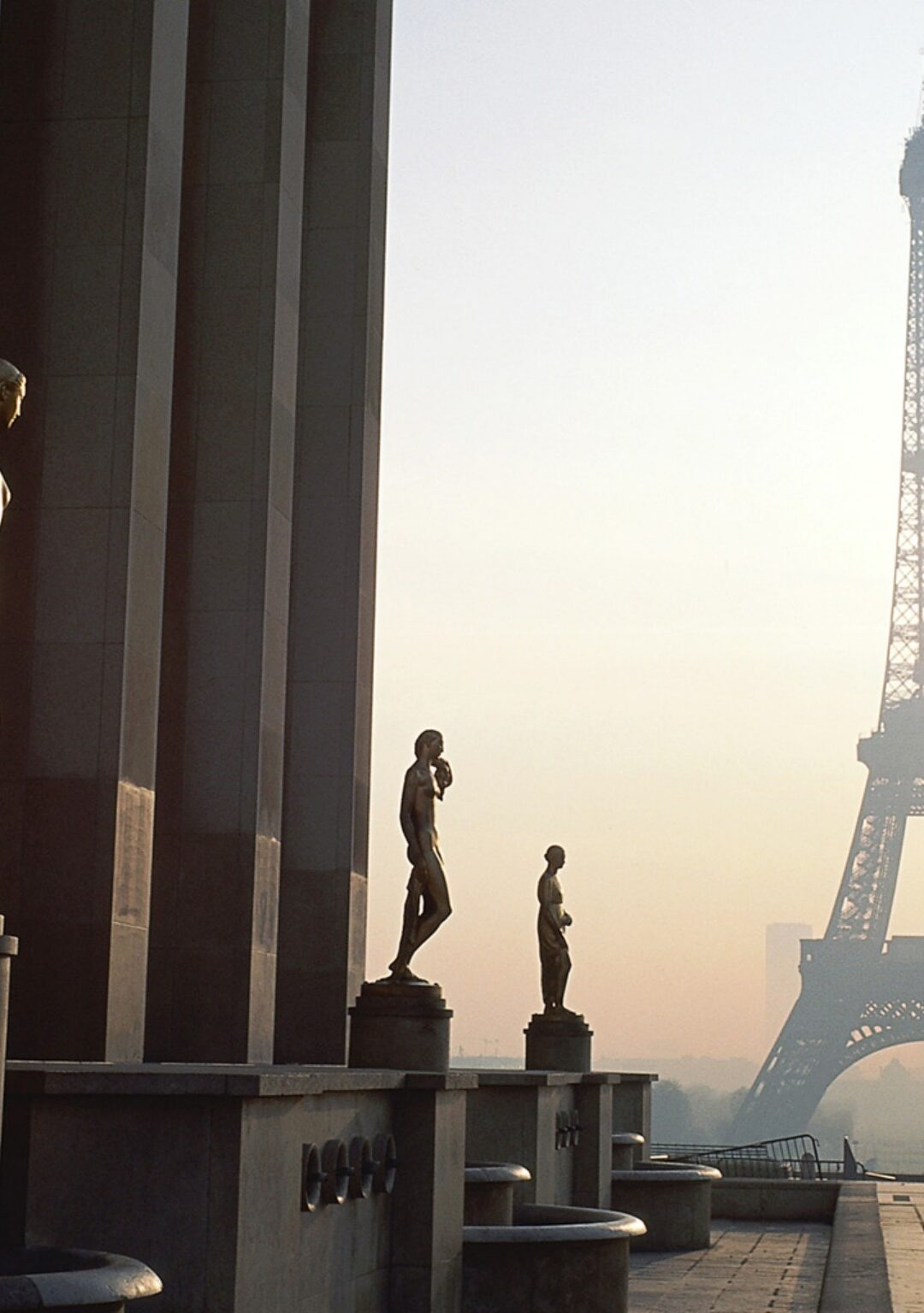 Three classical bronze statues stand sentinel on a stone platform as the Eiffel Tower glows against a warm golden-hour sky. The muted earth tones and soft diffused light give the whole scene a quiet, contemplative weight.