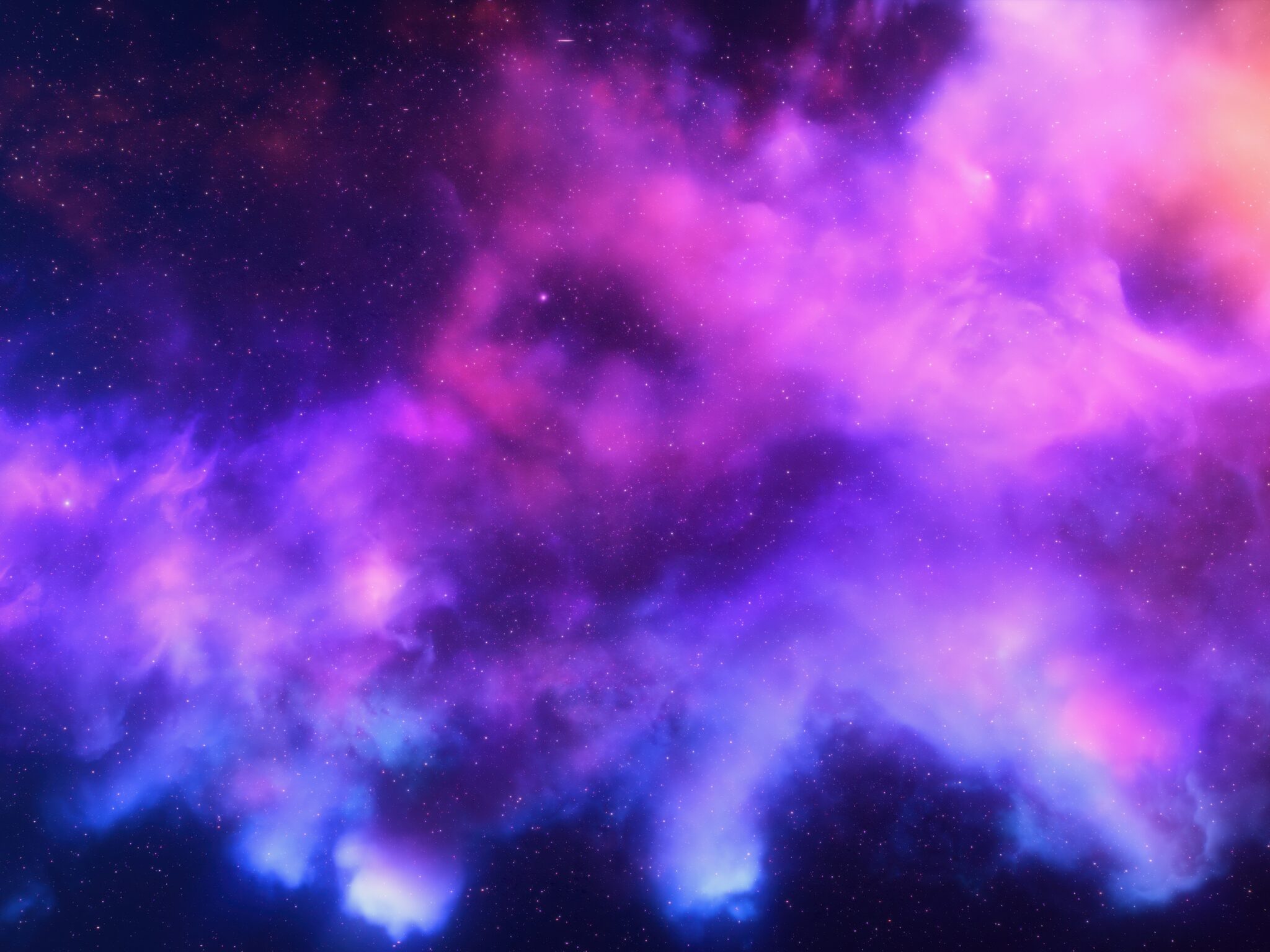 Vibrant purple and magenta nebula clouds swirl across a deep blue starfield with warm orange highlights creating a dreamy cosmic landscape. This ethereal space wallpaper works beautifully on 4K monitors and ultrawide displays.