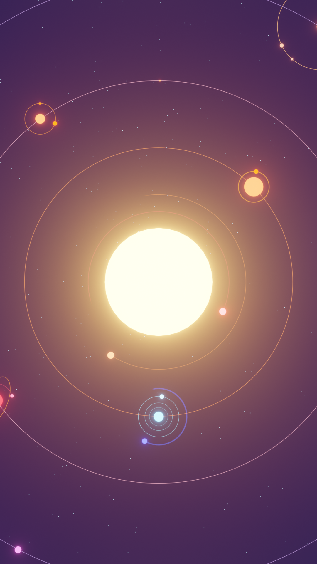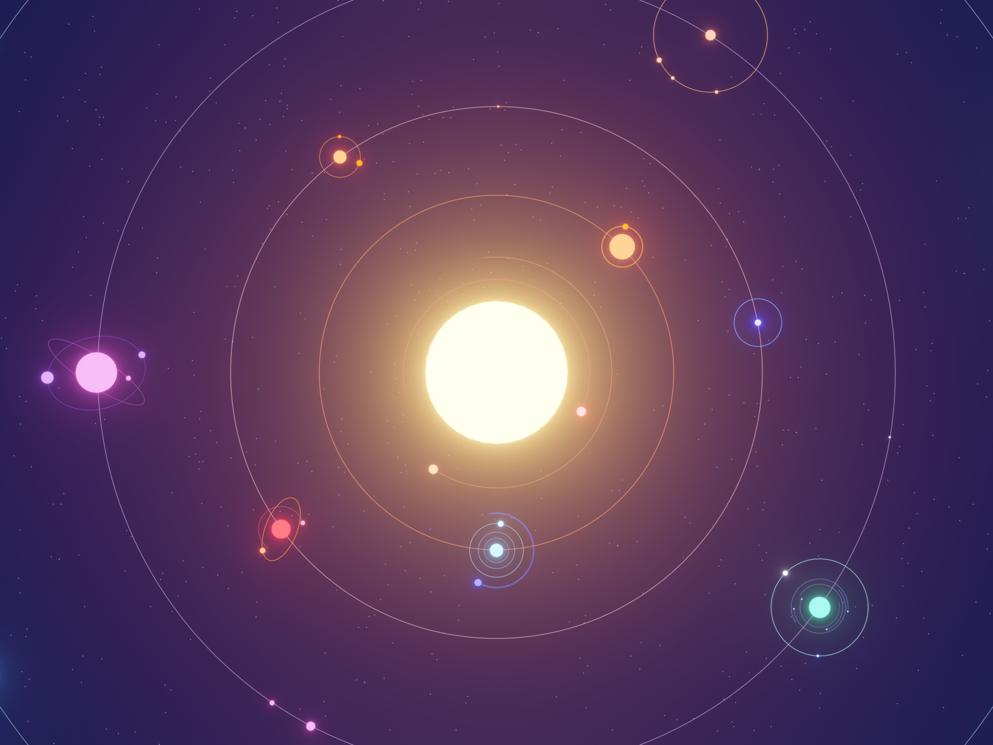 Colorful planets with orange, purple, green, and blue hues orbit around a bright white sun against a deep space backdrop with glowing orbita…