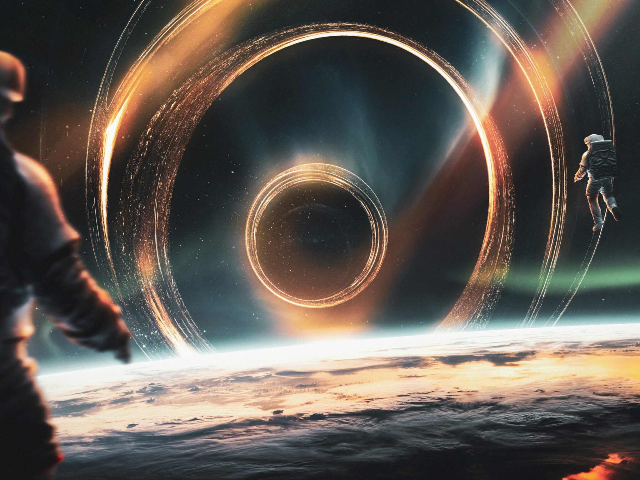 An astronaut floats near a massive black hole with glowing orange and golden rings against deep blue space above a planetary surface. This d