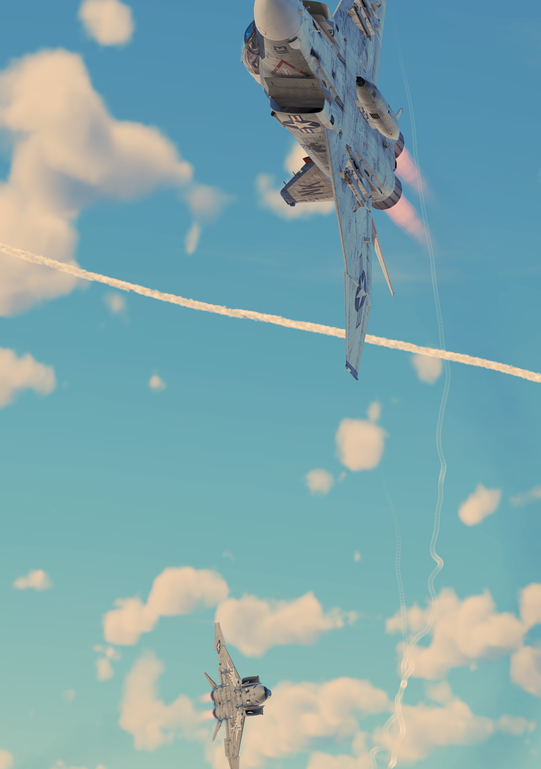 Two F-14 Tomcat jet fighters soar through a blue sky dotted with white clouds, leaving behind a trail of smoke.