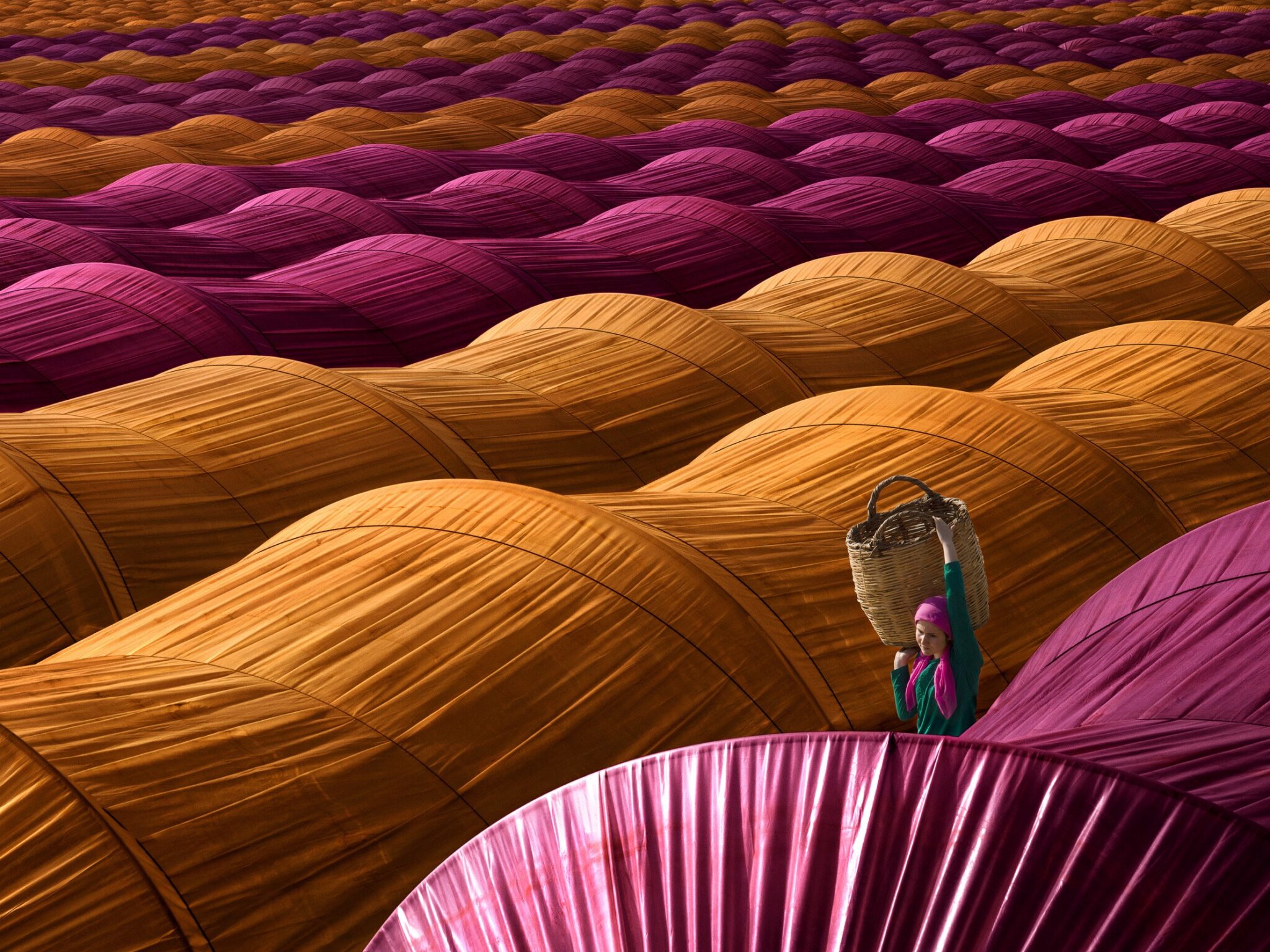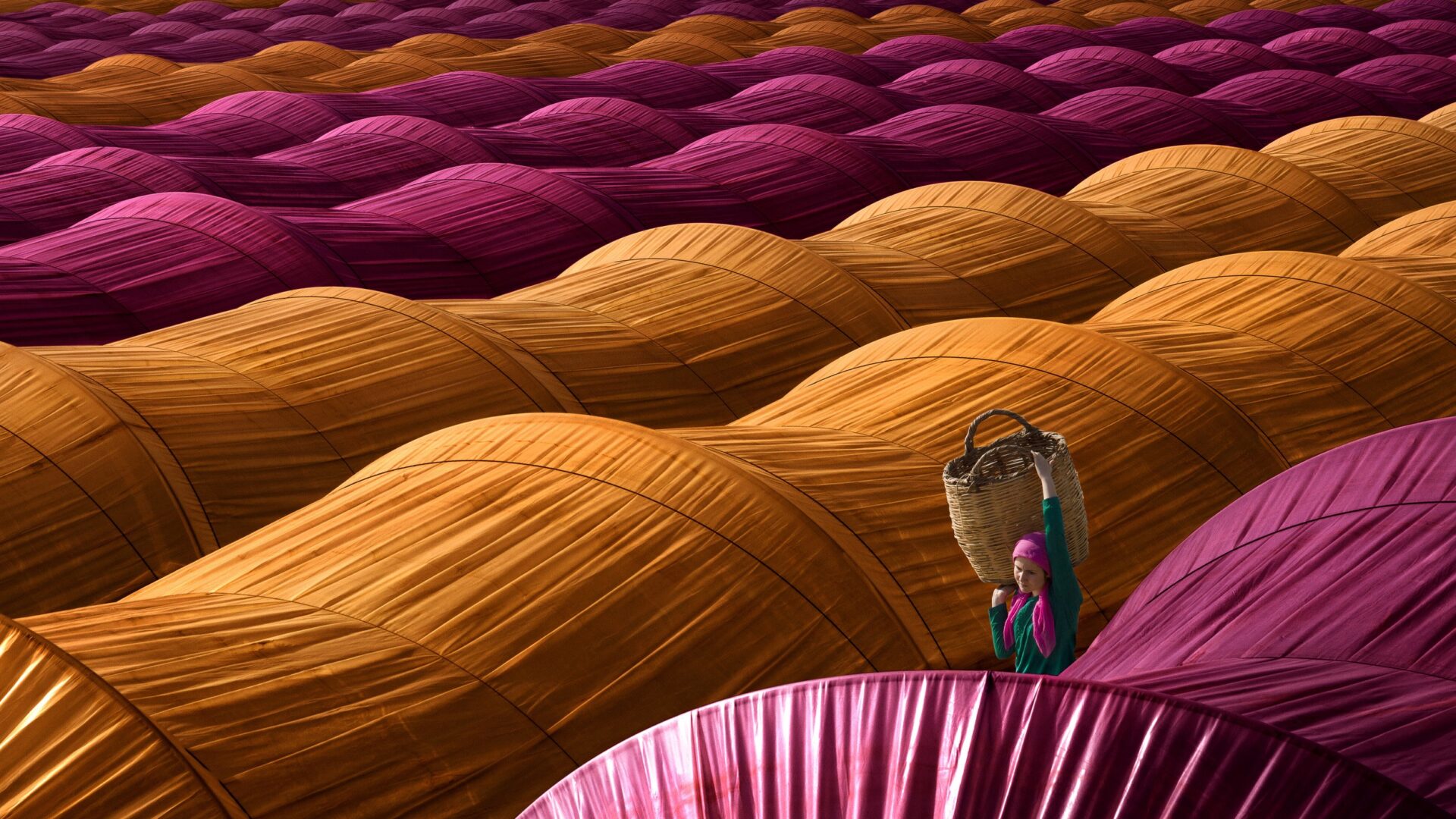 A lone figure with a woven basket on their back stands among endless rolling rows of billowing fabric domes shifting from warm gold to deep …