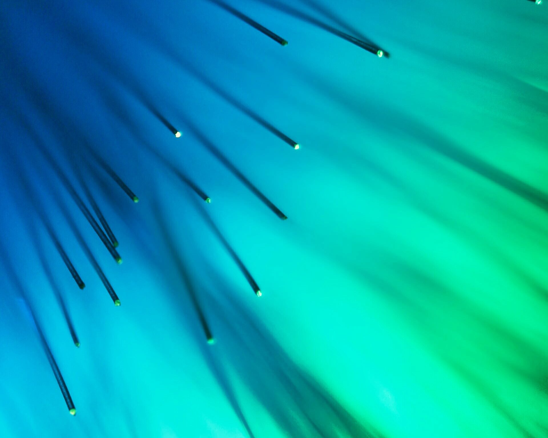 A cluster of fiber optic cables fans out diagonally, tips blazing neon green against a deep blue-to-green gradient. It's got that late-night…