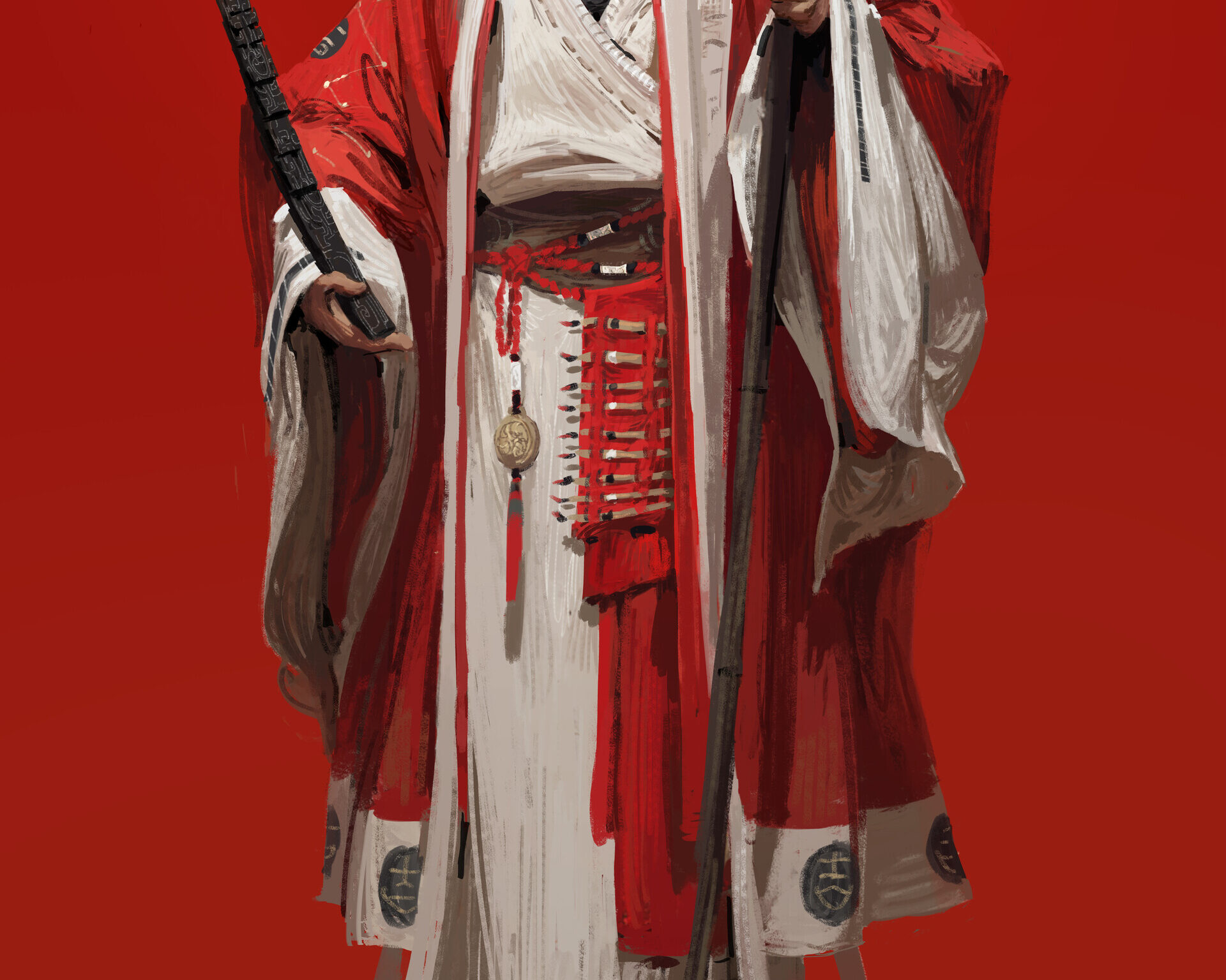 A full-body figure in ornate clothing stands centered against a solid red background. The layered fabrics and textured mask create a sense of depth with strong contrasts in white and red tones.