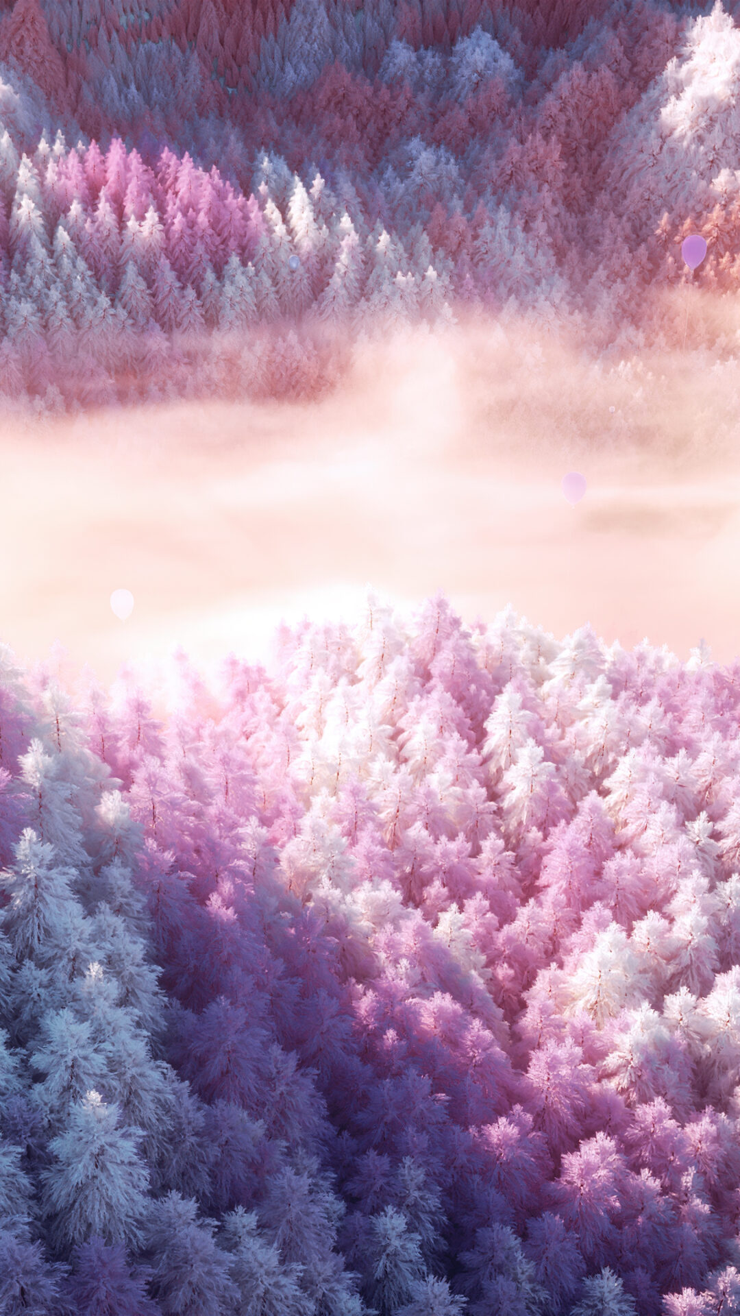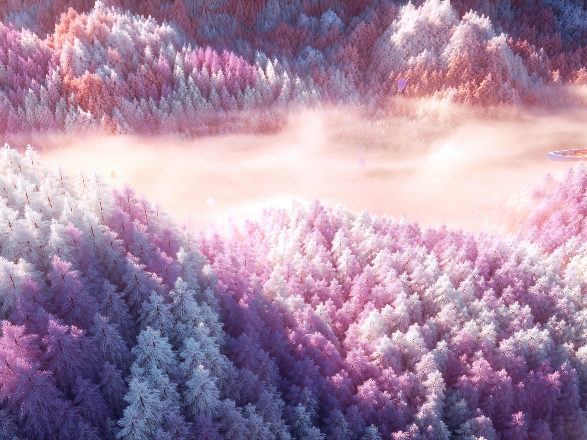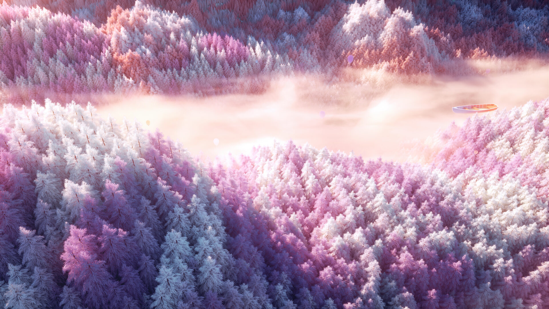 Surreal landscape shows purple and pink frosted trees blanketing rolling hills with misty fog drifting through the valleys and a small boat