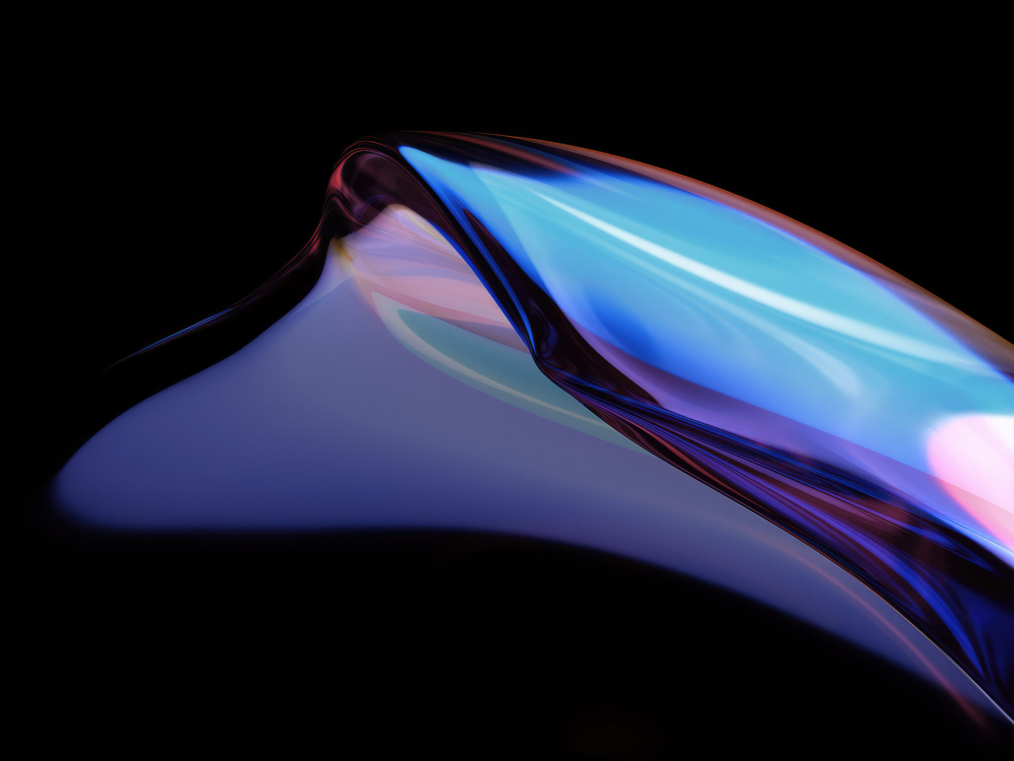 A close-up depicts flowing shapes in shades of blue, purple, and pink against a black background. The glossy surface reflects light and creates a sense of depth and motion.