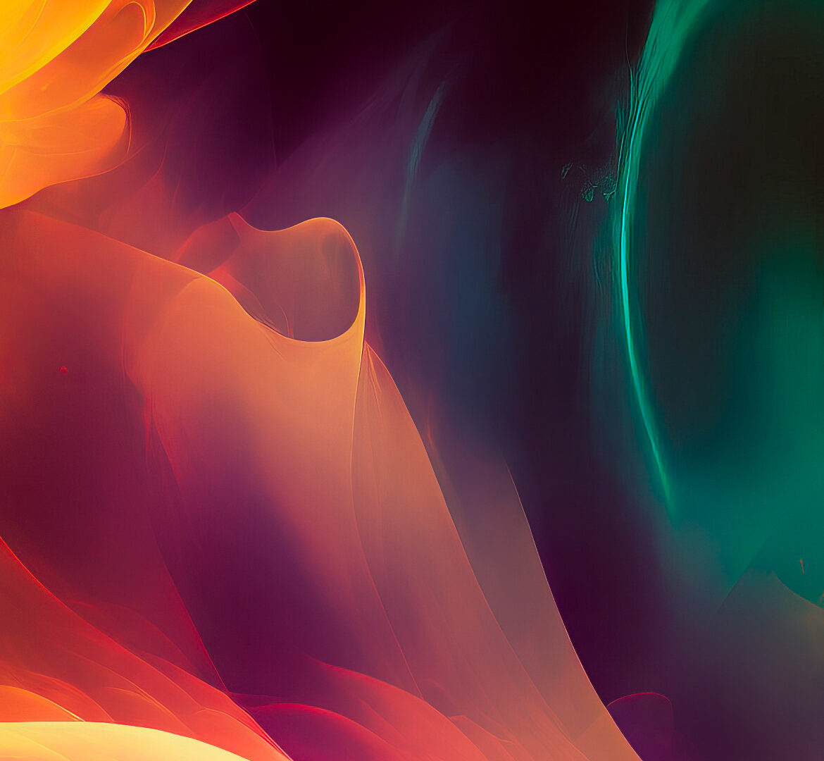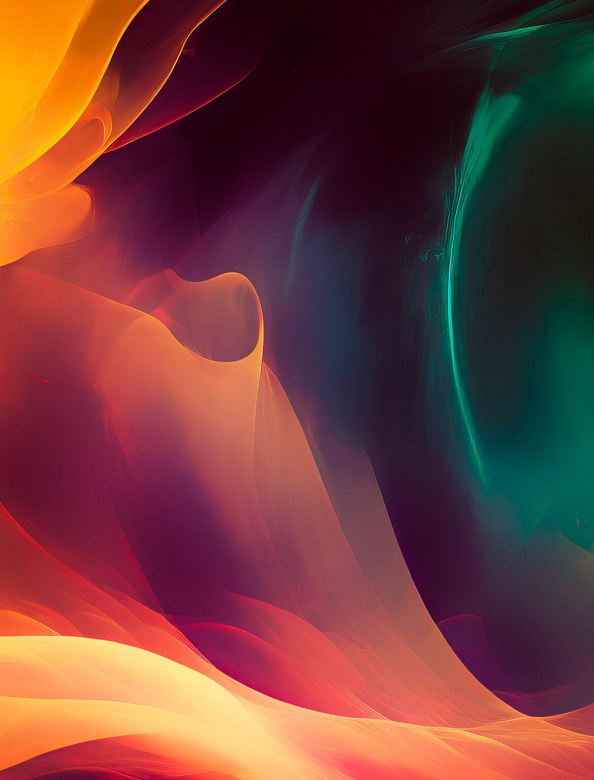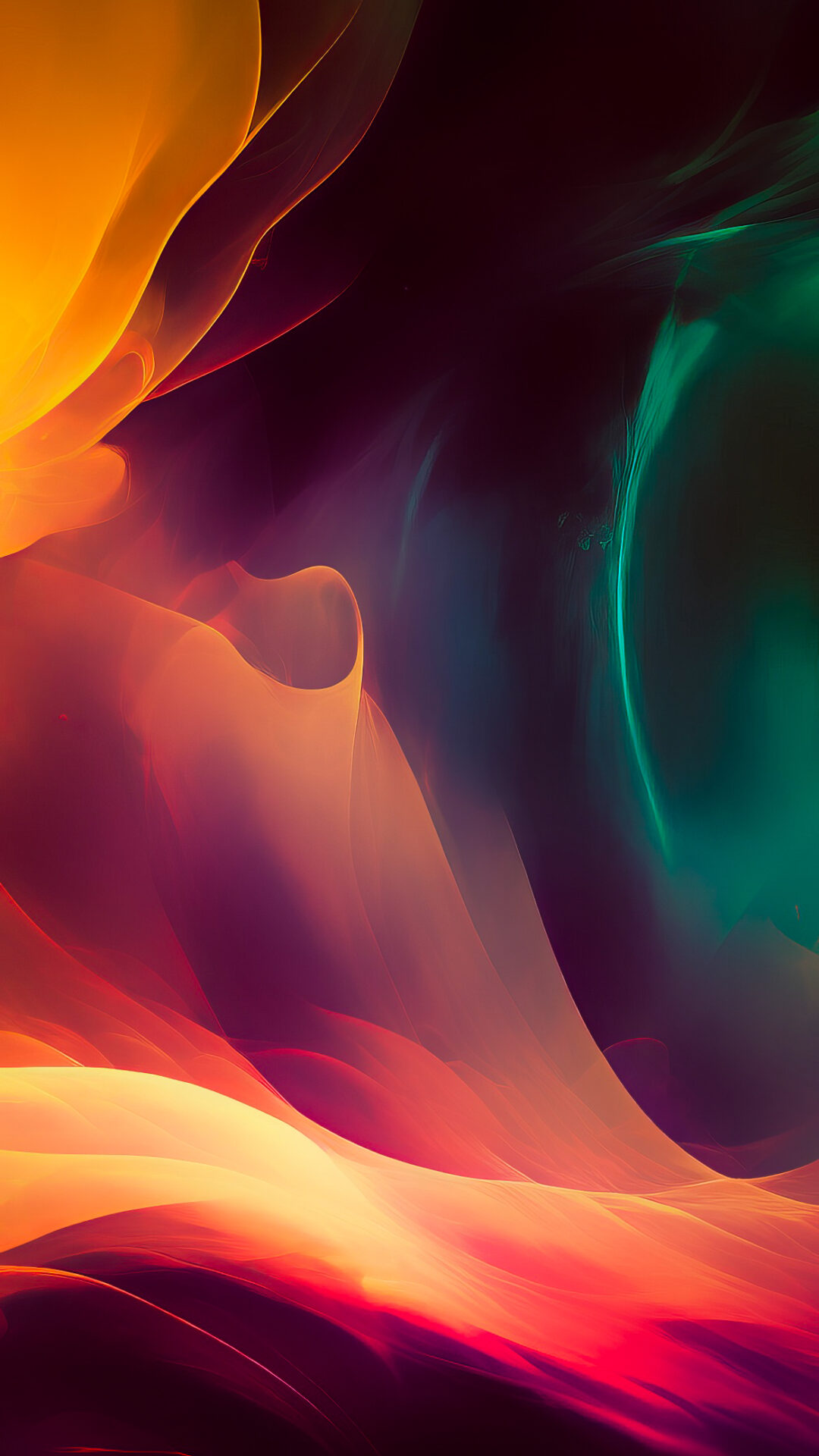Flowing, ribbon-like shapes fill the frame in a dark composition. The warm tones of red and orange contrast with cooler teal and gold highli…
