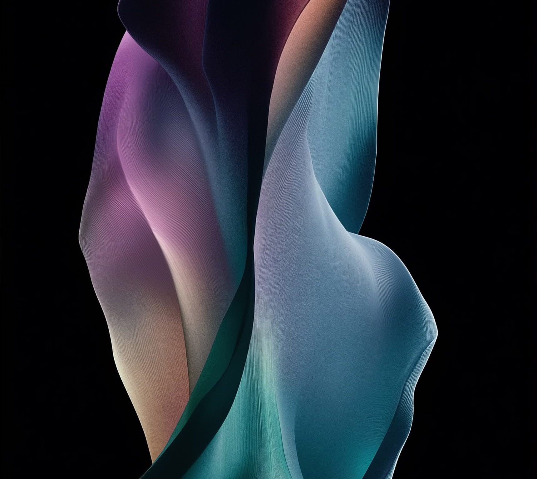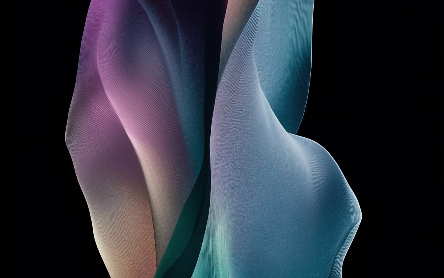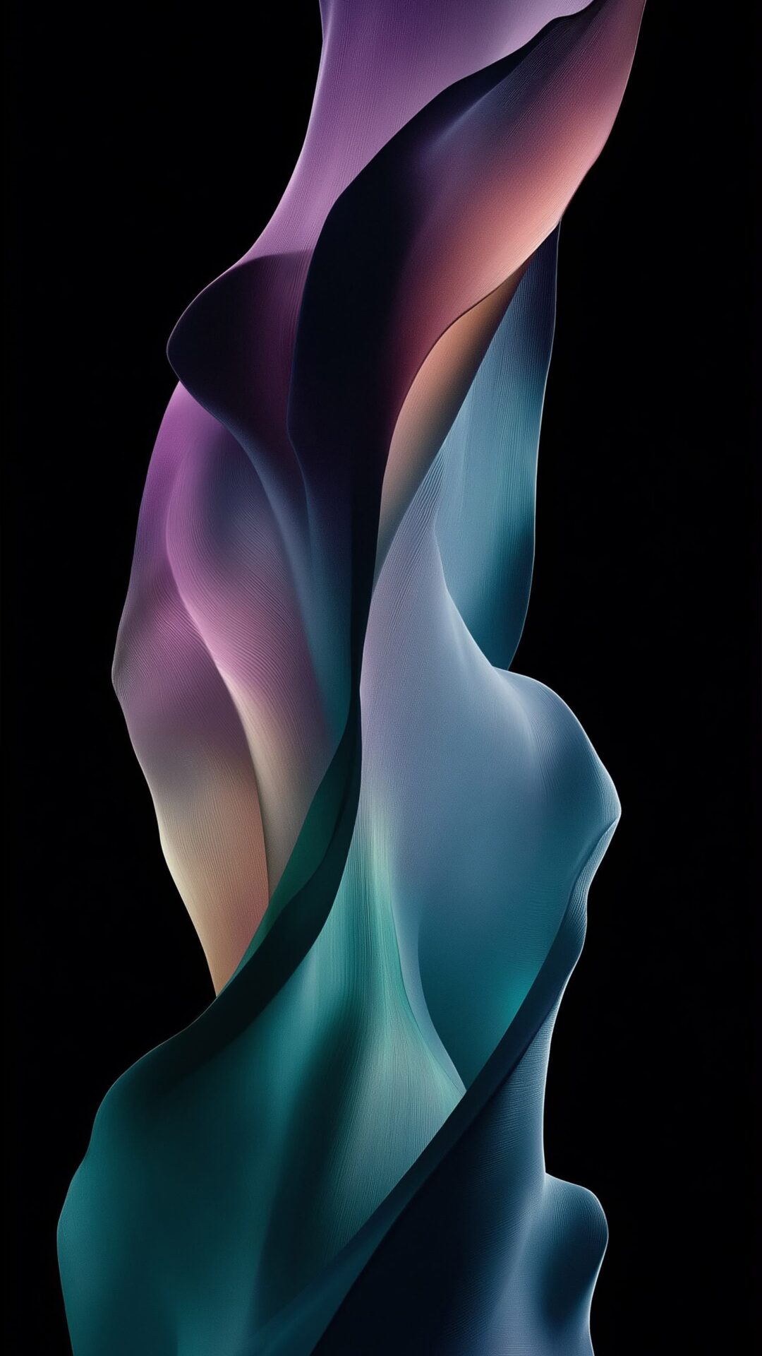 Gradient ribbons of color twist upward against a dark background. The surfaces have a smooth, glossy texture with subtle light reflections.