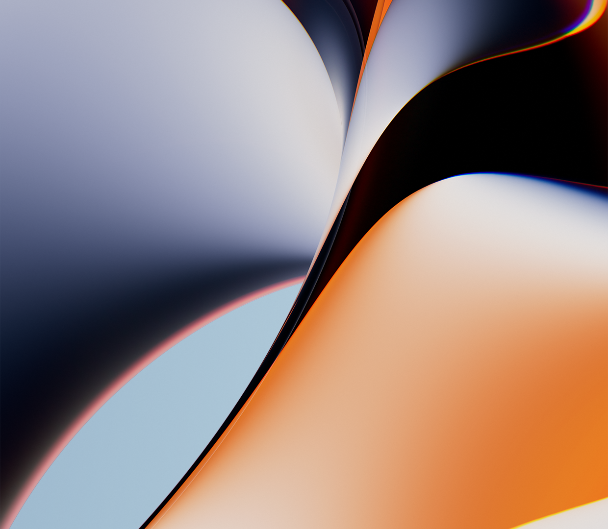 Curving shapes fill the frame, a composition of rounded volumes against a light blue backdrop. The polished surfaces reflect soft highlights and transitions between orange, black, and white tones.