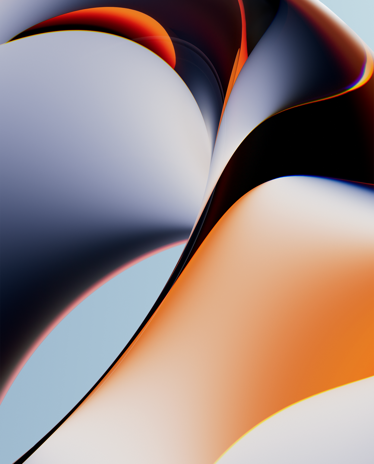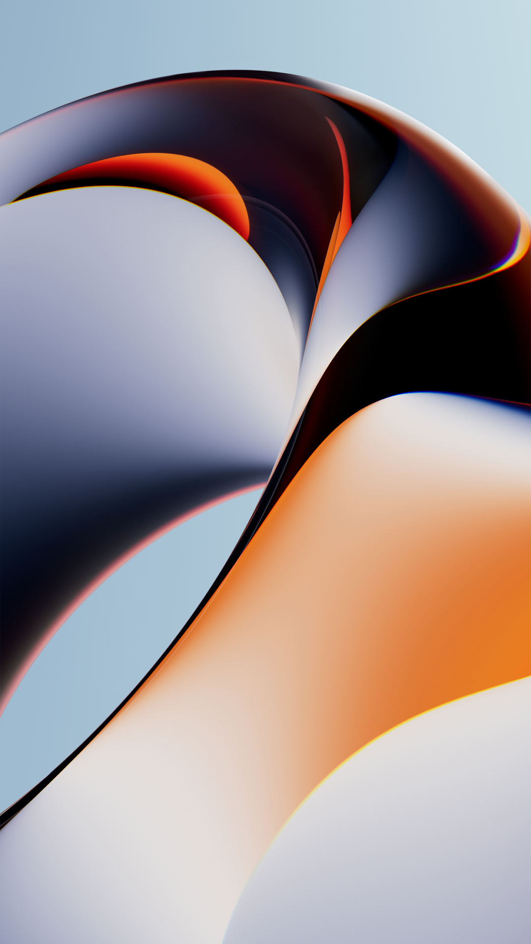 Curving shapes fill the frame, a composition of rounded volumes against a light blue backdrop. The polished surfaces reflect soft highlights and transitions between orange, black, and white tones.
