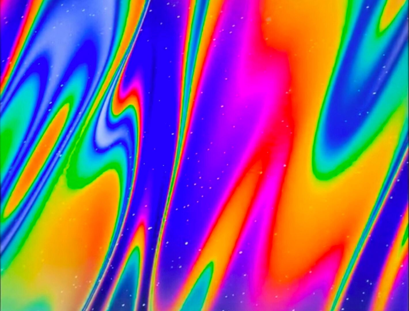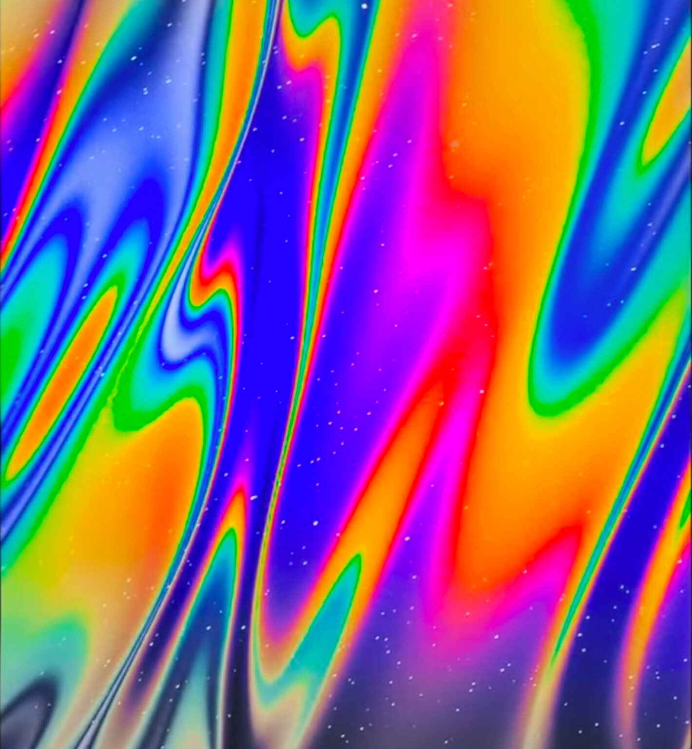 Colorful fluid shapes flow diagonally across a dark background. The glossy surface reflects light creating shifting highlights and a sense o