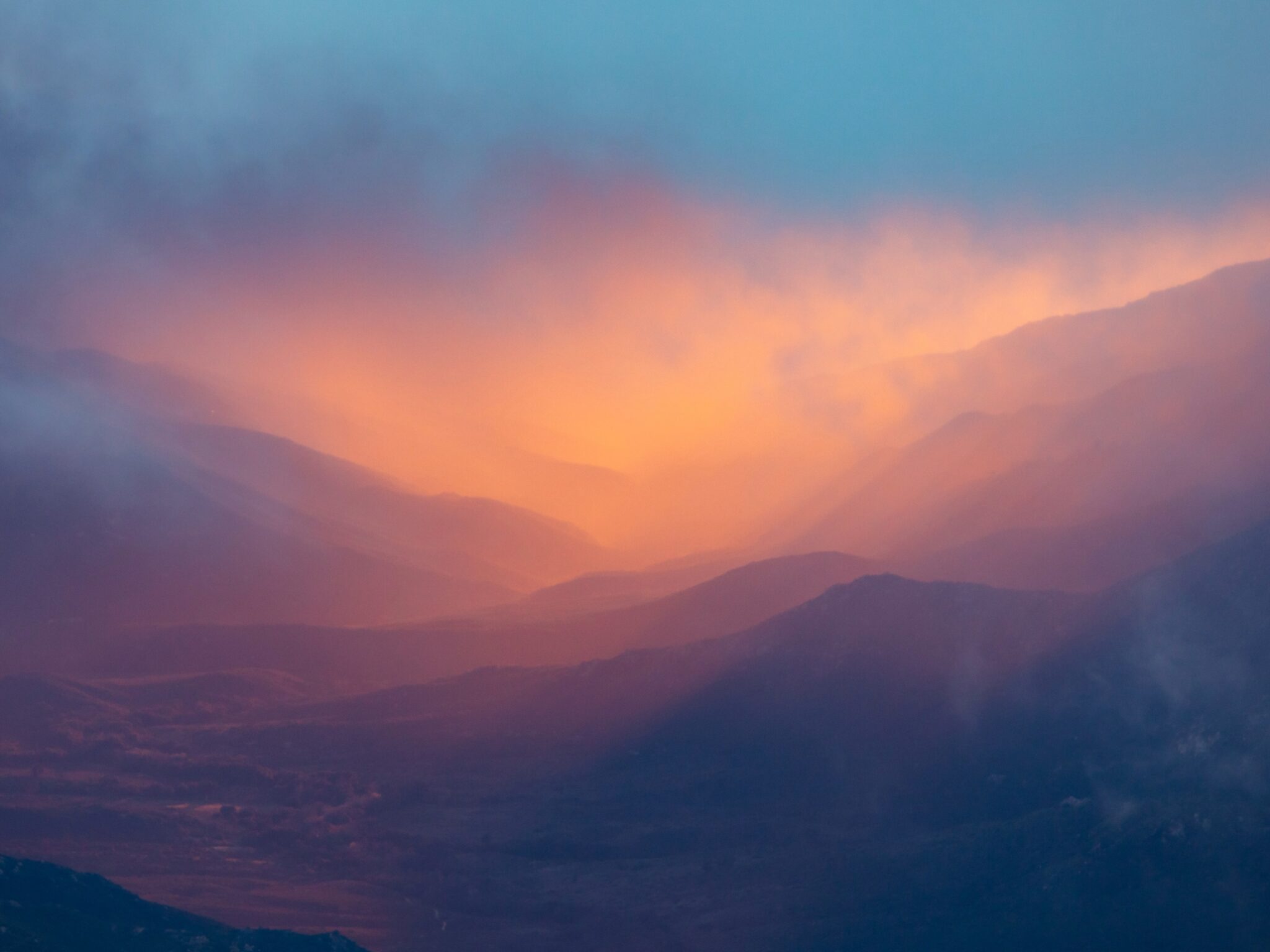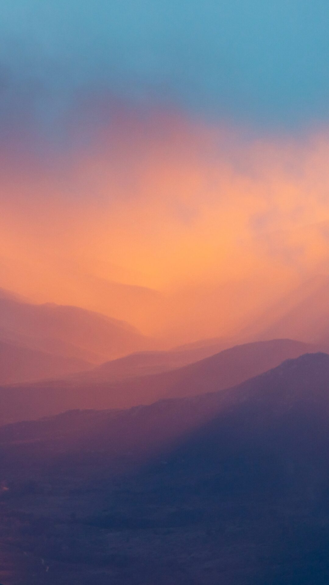 Rolling mountain ridges fade into soft purple and blue silhouettes while golden orange light glows through the misty valley below. This atmo