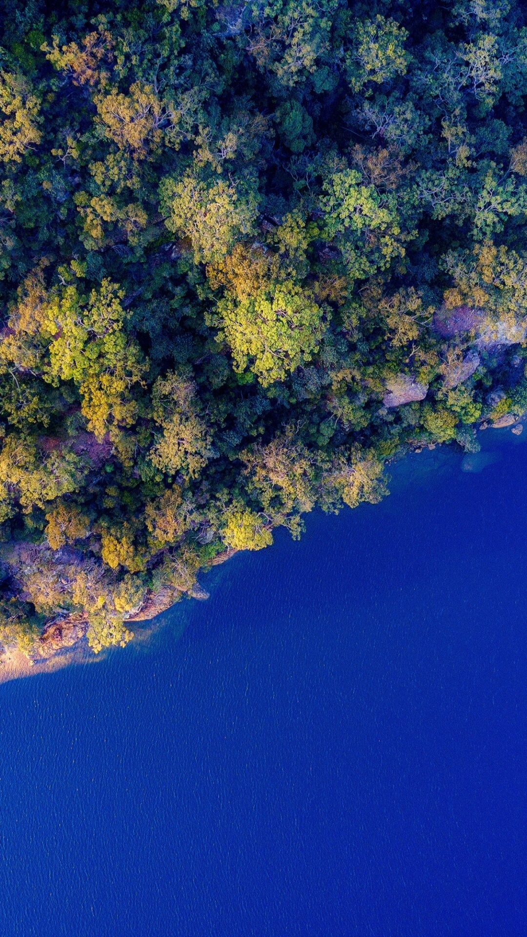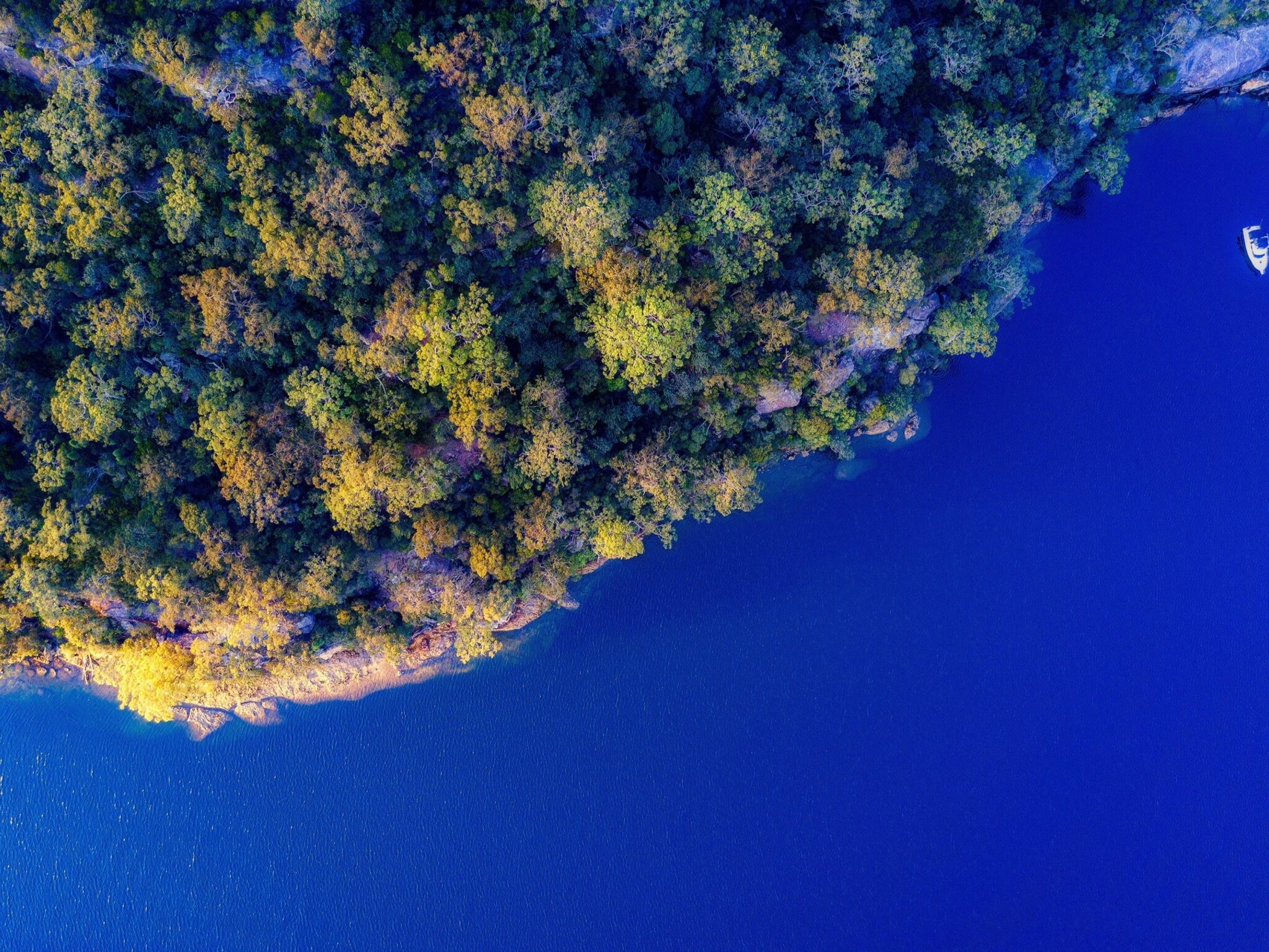 Forest Edge Blue Water | Overhead View Desktop wallpaper 4K