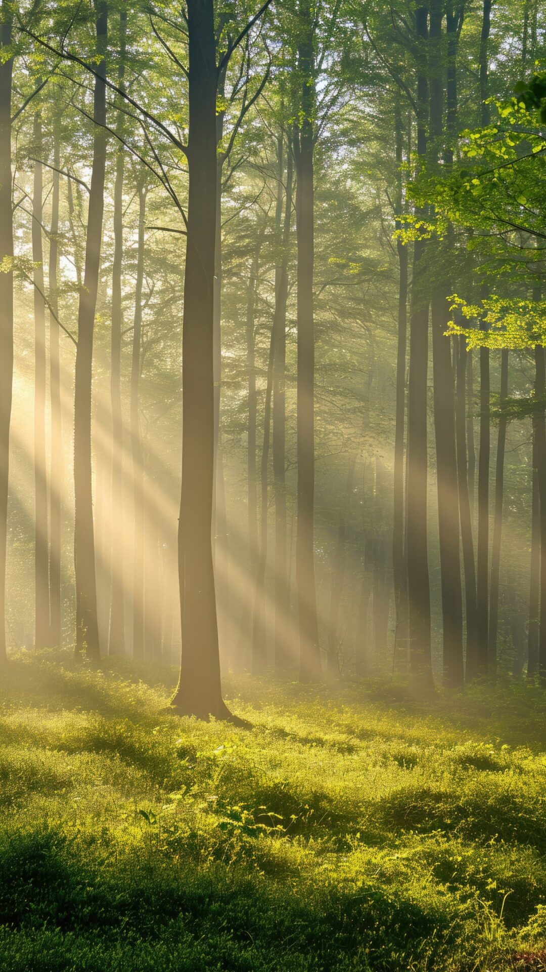 Sunlight streams through a dense forest of tall trees onto a green forest floor. The light creates a soft glow and emphasizes the vertical l