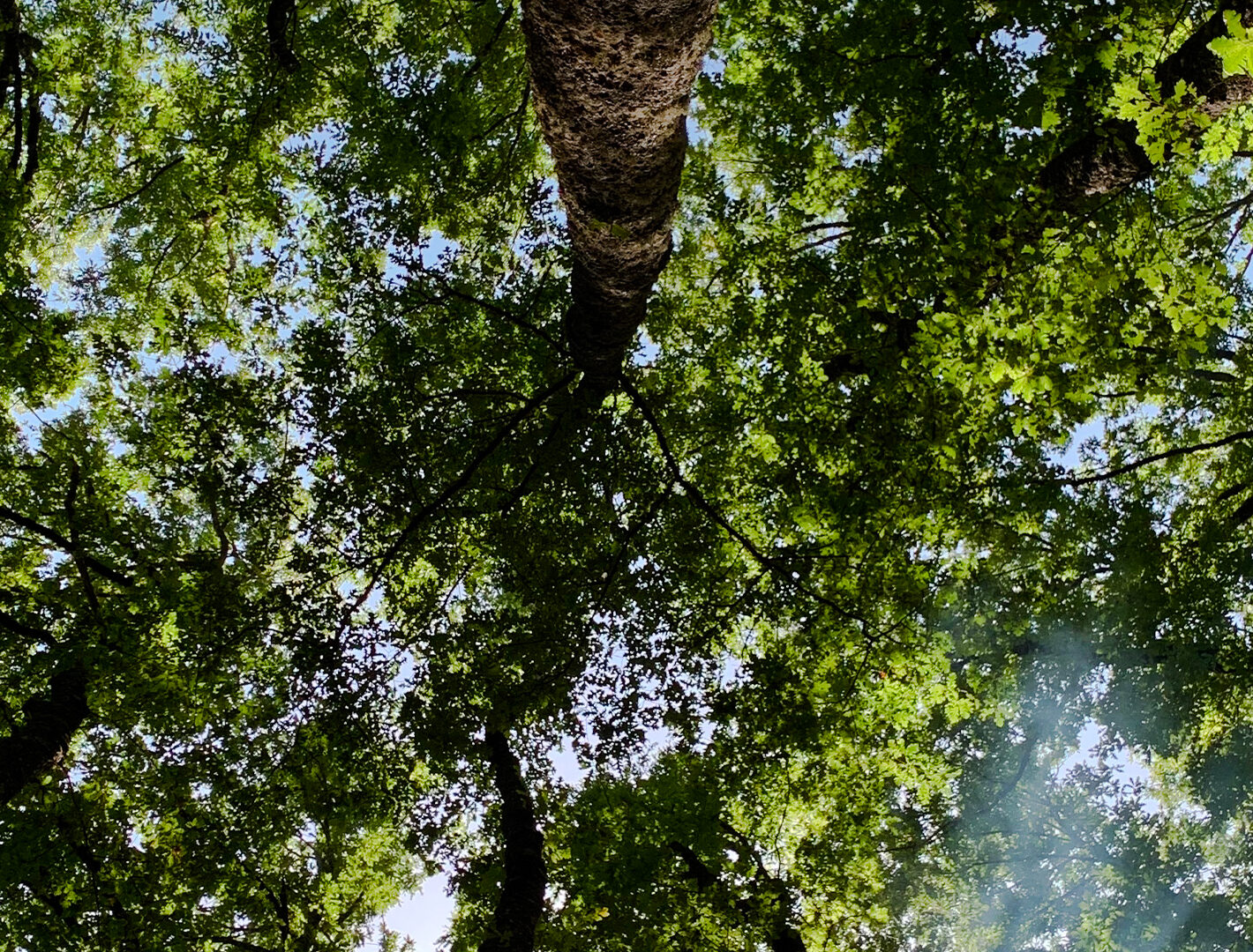 Tall trees rise towards a pale blue sky, viewed from a low angle. Light filters through the dense green canopy, creating areas of shadow and