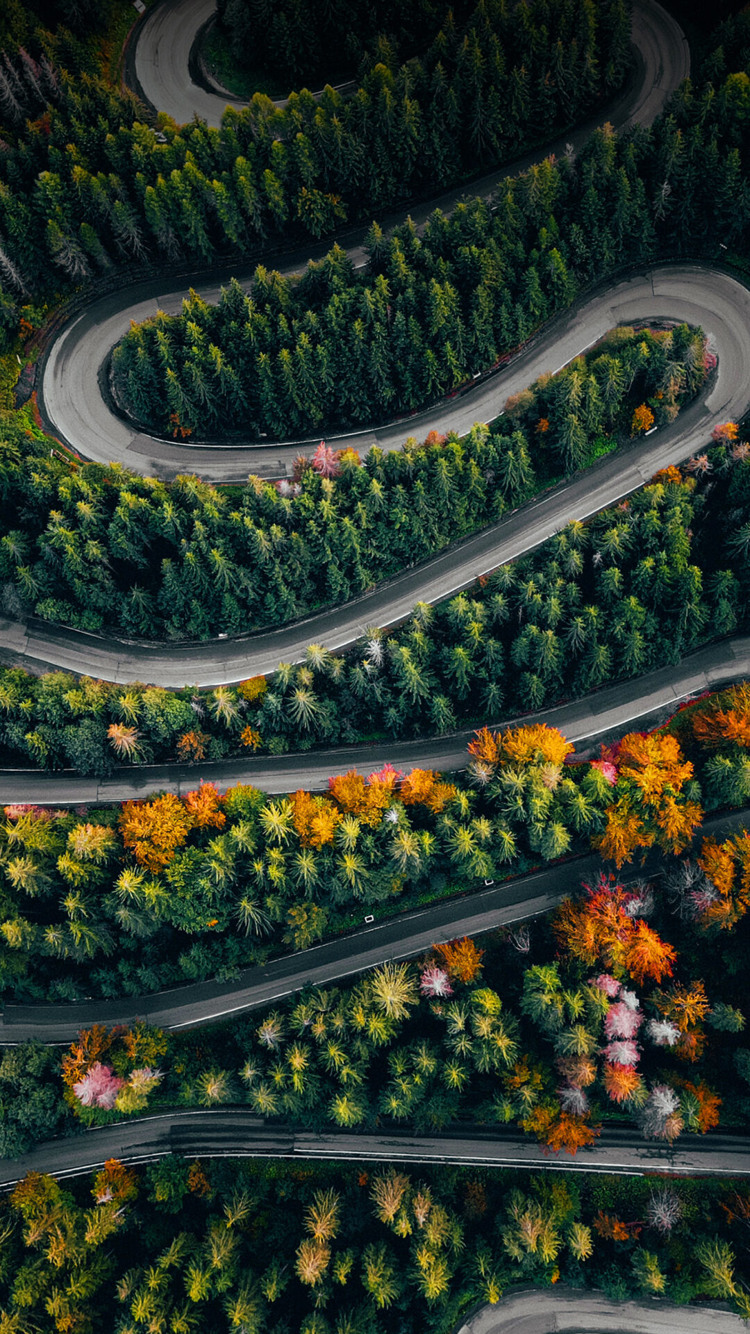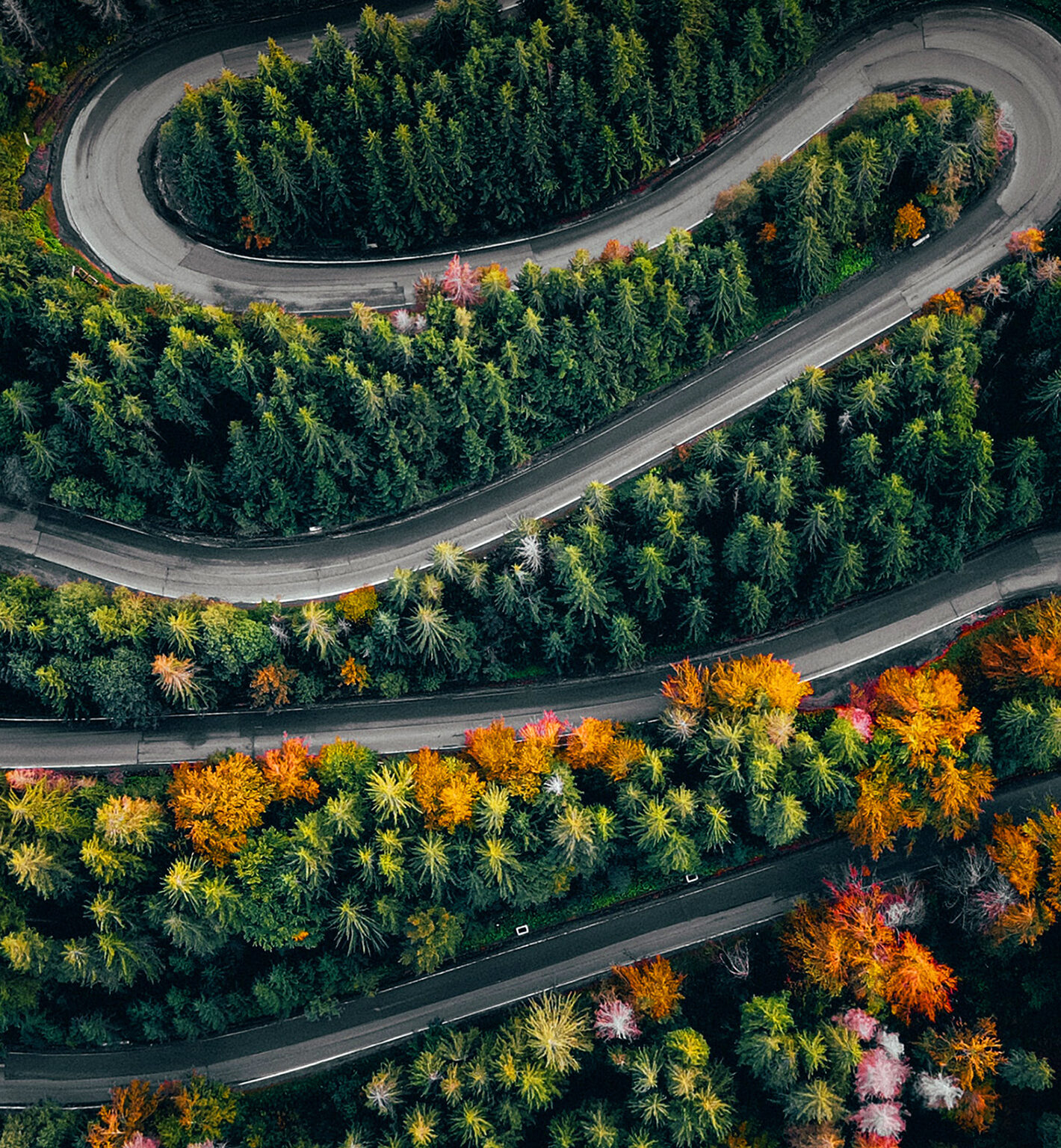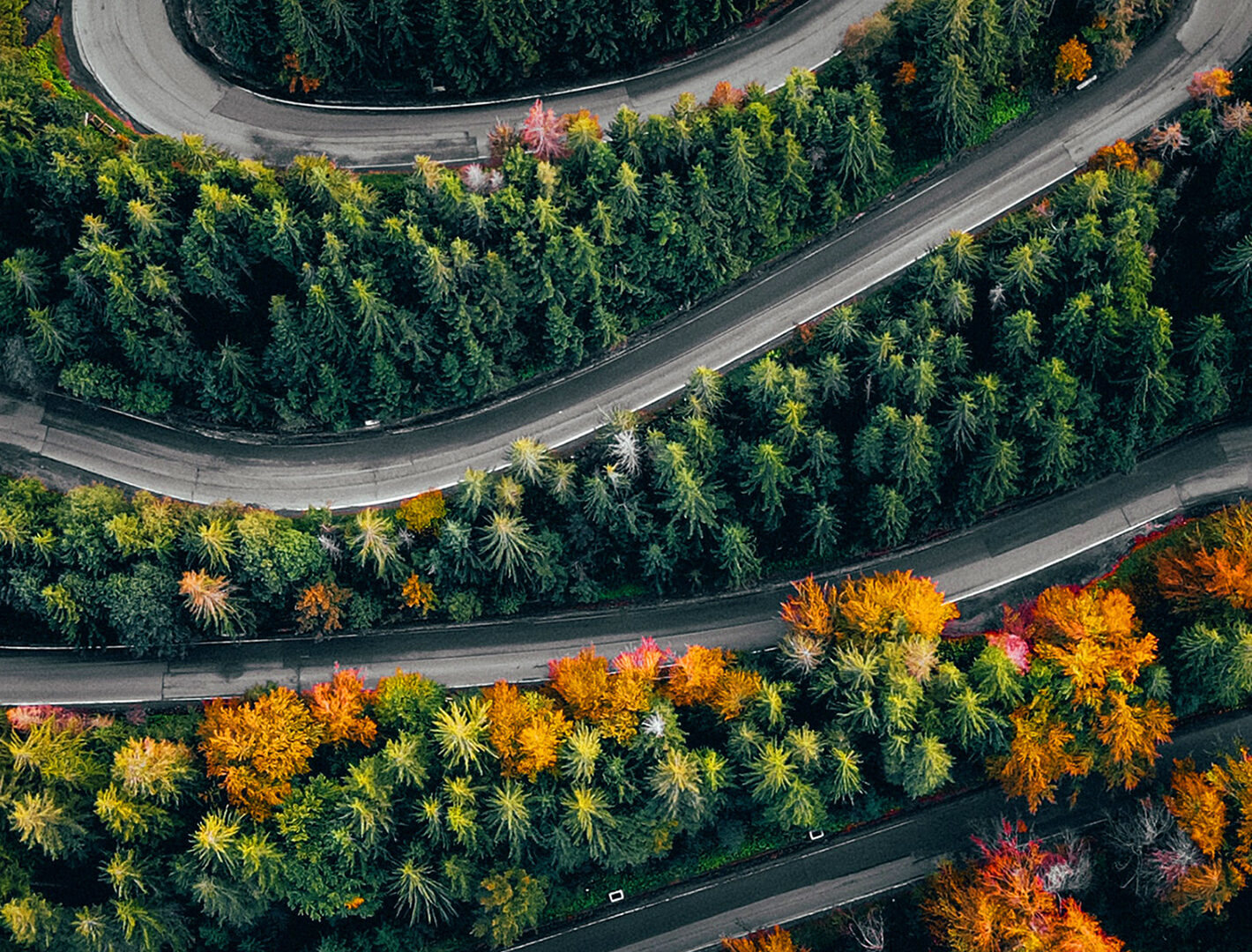 An aerial view presents a gray road snaking through dense green and orange forest. Sunlight highlights the varied textures of the trees and the road’s asphalt surface.