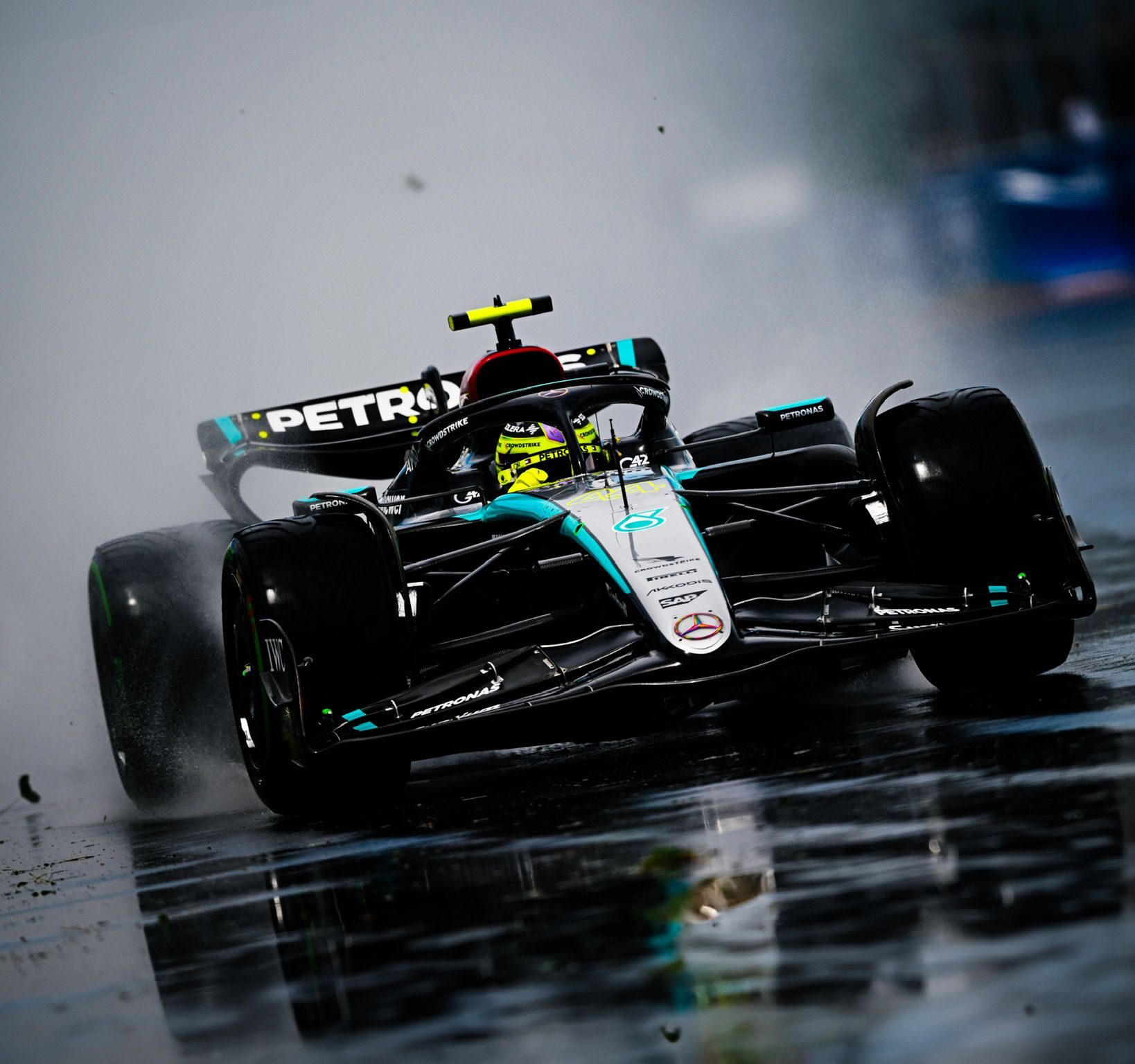 A black Formula 1 car speeds along a wet race track, kicking up spray. The reflection in the water creates a blurred duplication of the car