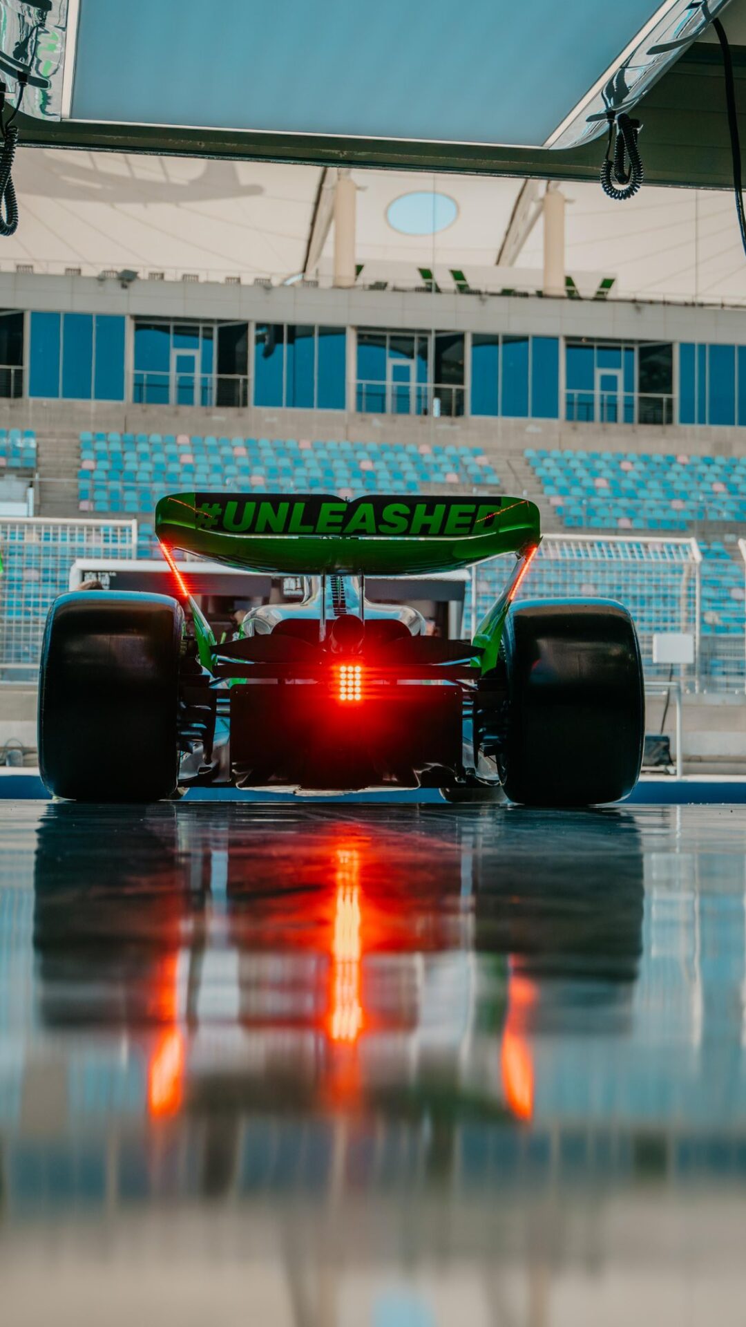 A Formula car is parked on a glossy black surface with stadium seating in the background. The bright red taillights and the reflection on th…