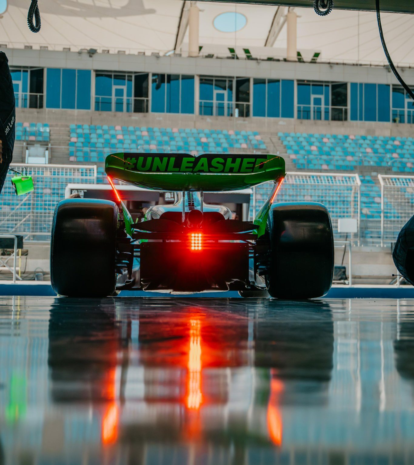 A Formula car is parked on a glossy black surface with stadium seating in the background. The bright red taillights and the reflection on the floor create a strong vertical line through the composition.