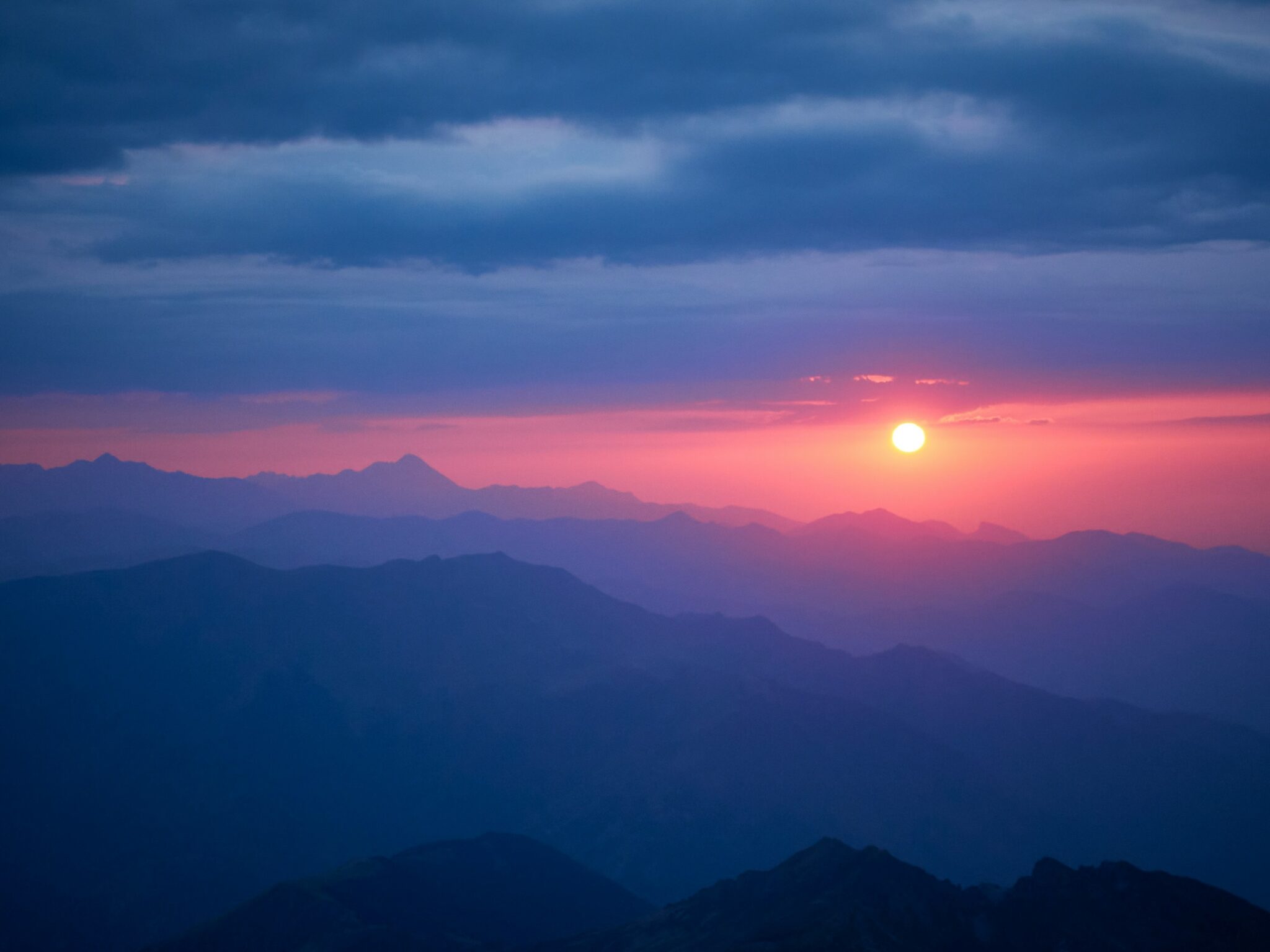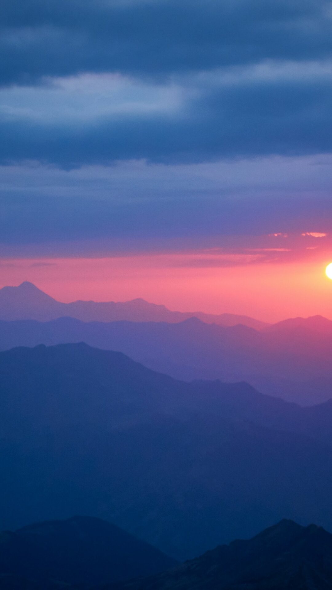 Golden sunrise breaks through purple and pink clouds over layered mountain ridges in the French Alps, creating a dreamy gradient from deep blue to warm orange. Works beautifully for 4K monitors where you can appreciate all those subtle color transitions.