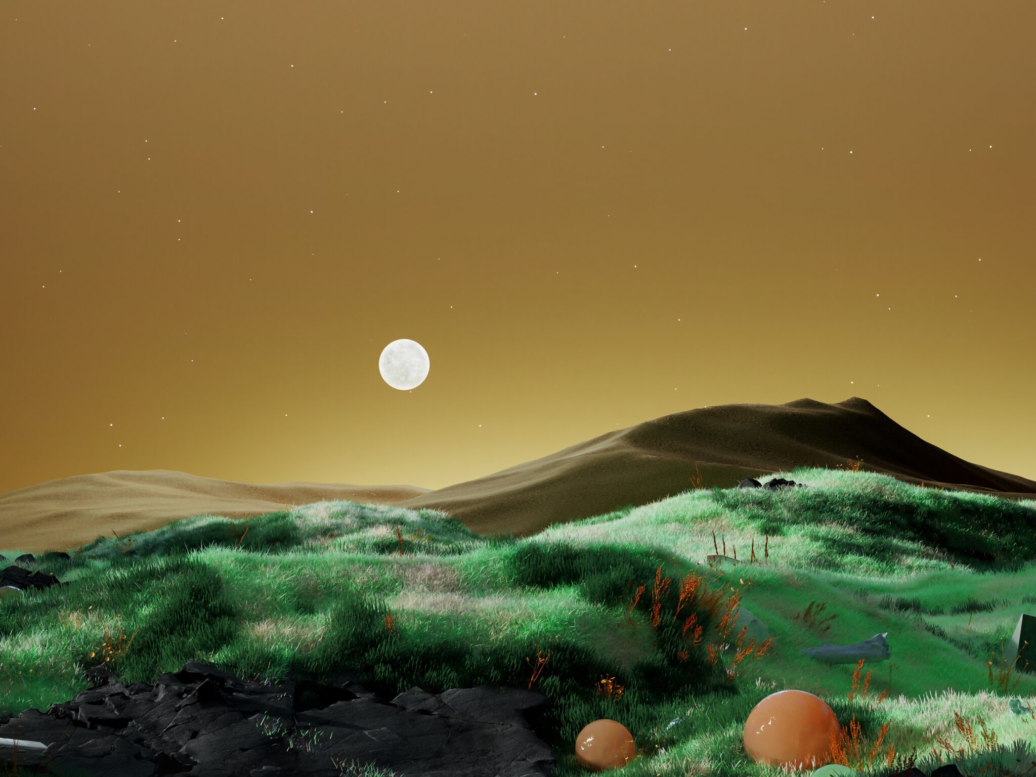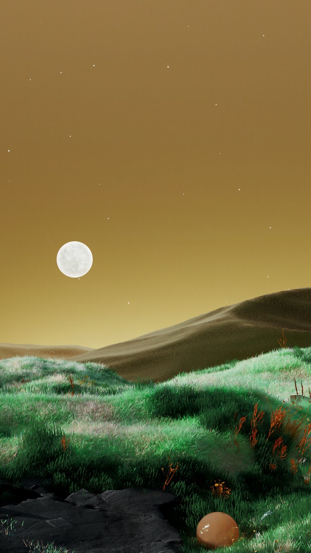 Glowing green hills roll beneath a bright full moon against a golden-brown starlit sky, with mysterious orange orbs scattered across the sur