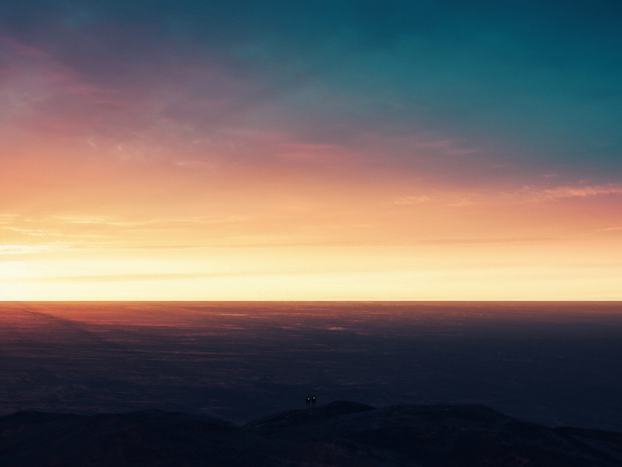 Vibrant sunset colors blend from deep teal blue at the top to warm orange and pink hues near the horizon, with dark mountain silhouettes cre