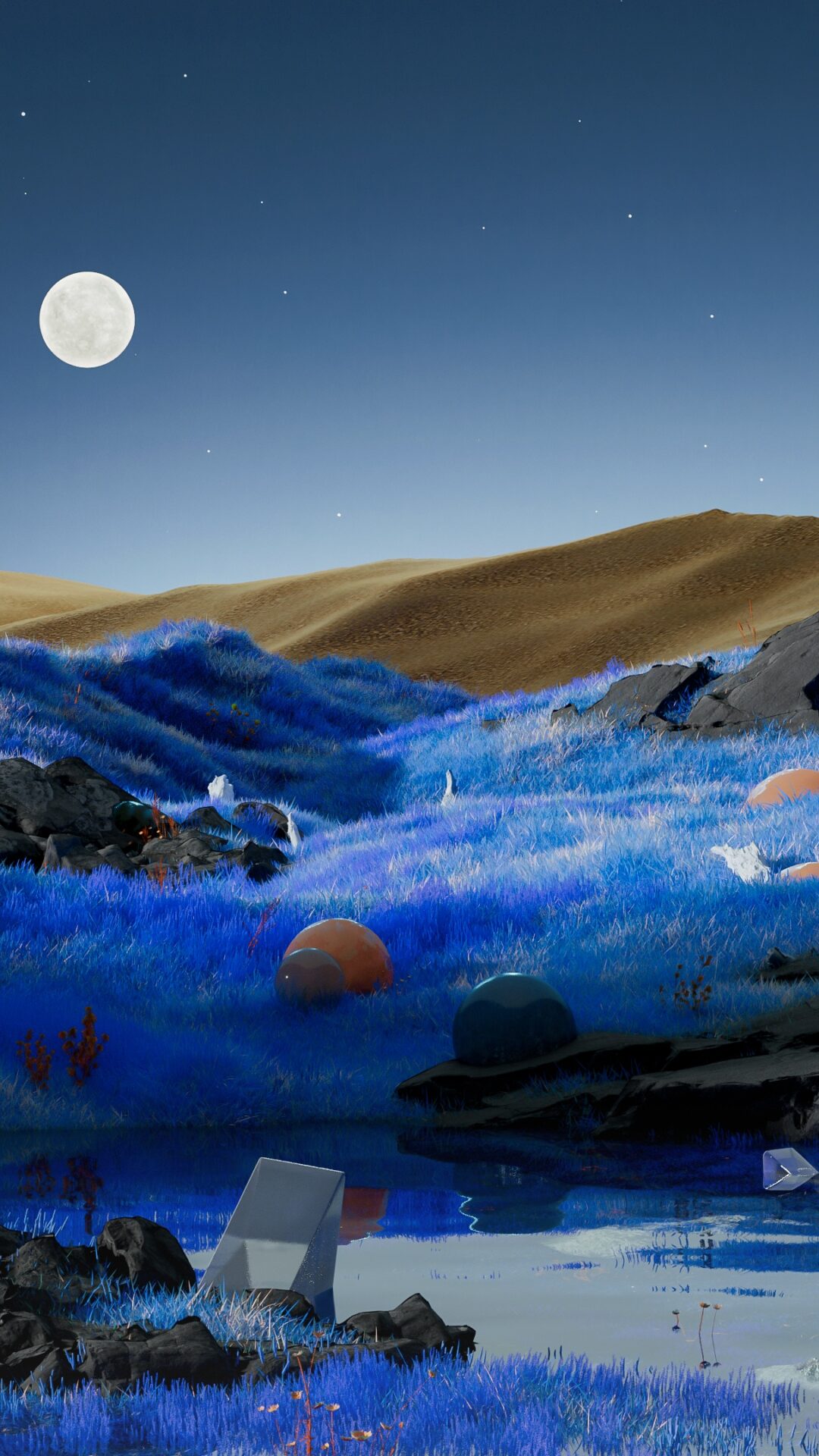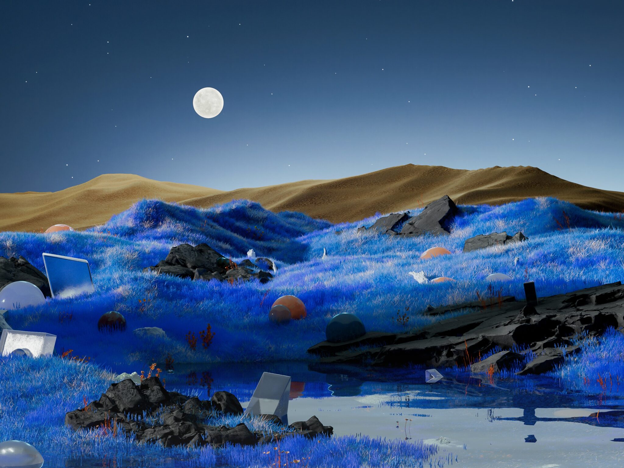 A dreamy landscape features vivid blue grass and terrain scattered with dark rocks and geometric objects under a bright full moon and starry