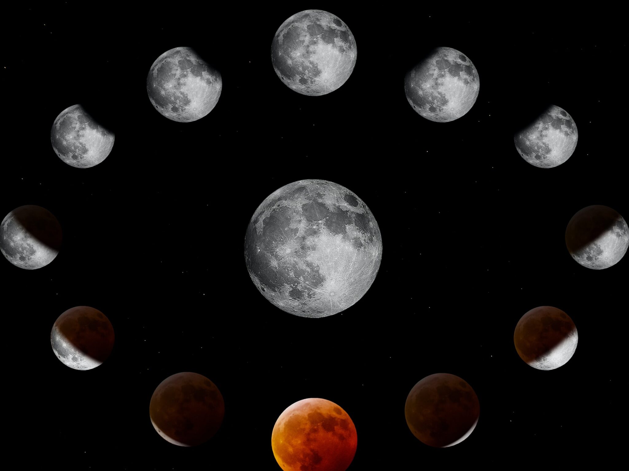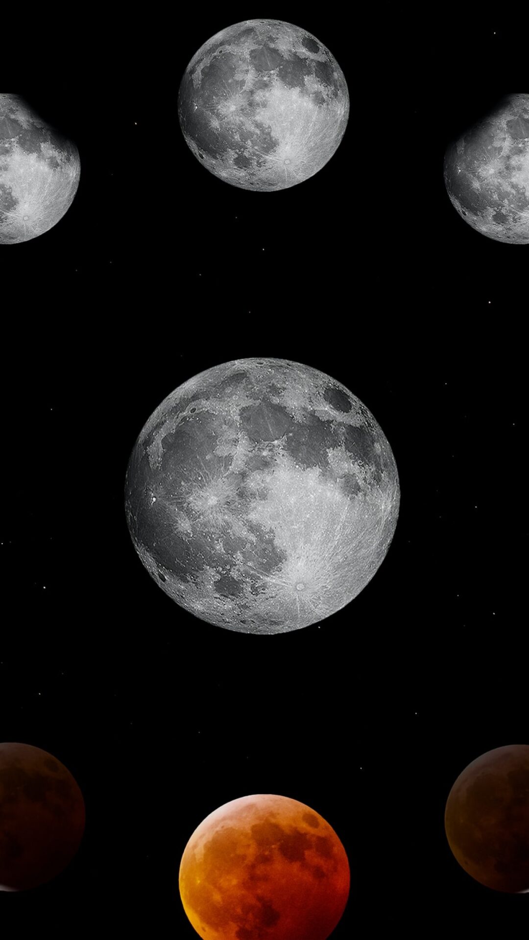 Watch the moon transform through a complete lunar eclipse cycle, from bright silver full moons to deep reddish-orange totality against the b