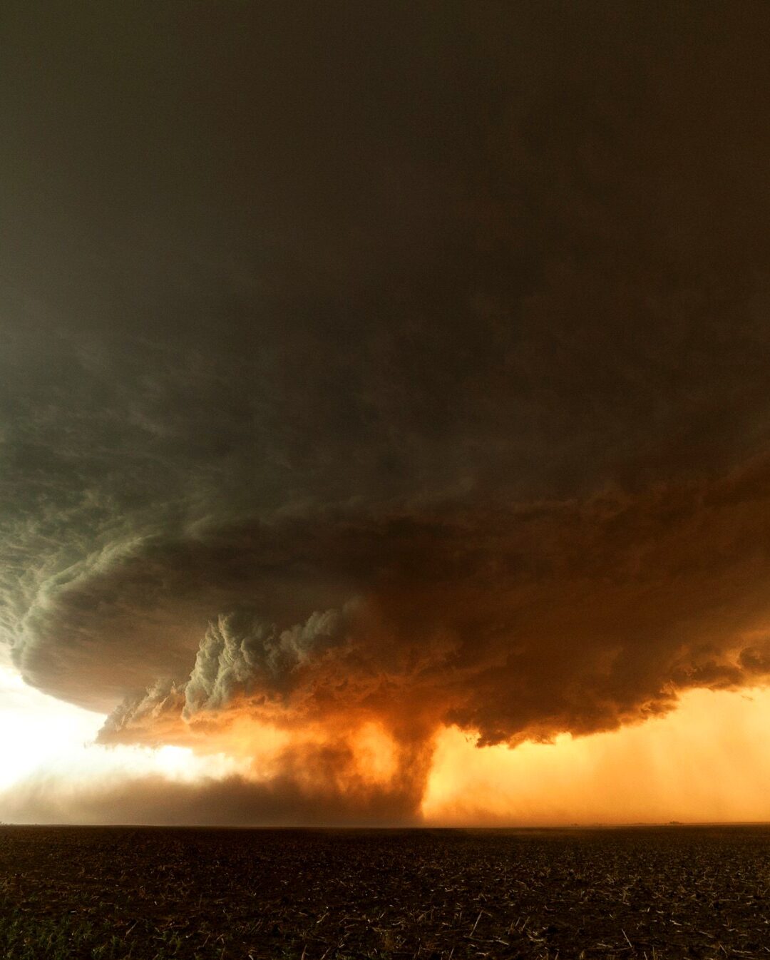 A tornado drops from a churning storm cell while the setting sun ignites the sky behind it in deep amber and orange. The tension between des