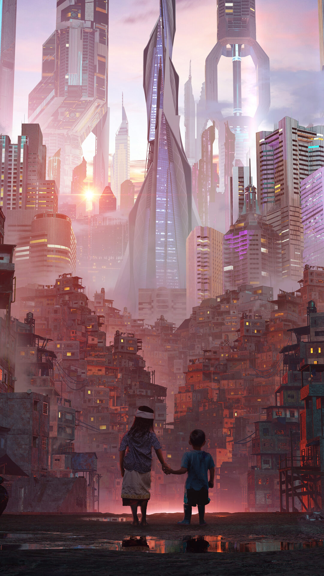Futuristic Cityscape with Couple Holding Hands Desktop Wallpaper 4K wallpaper 4K
