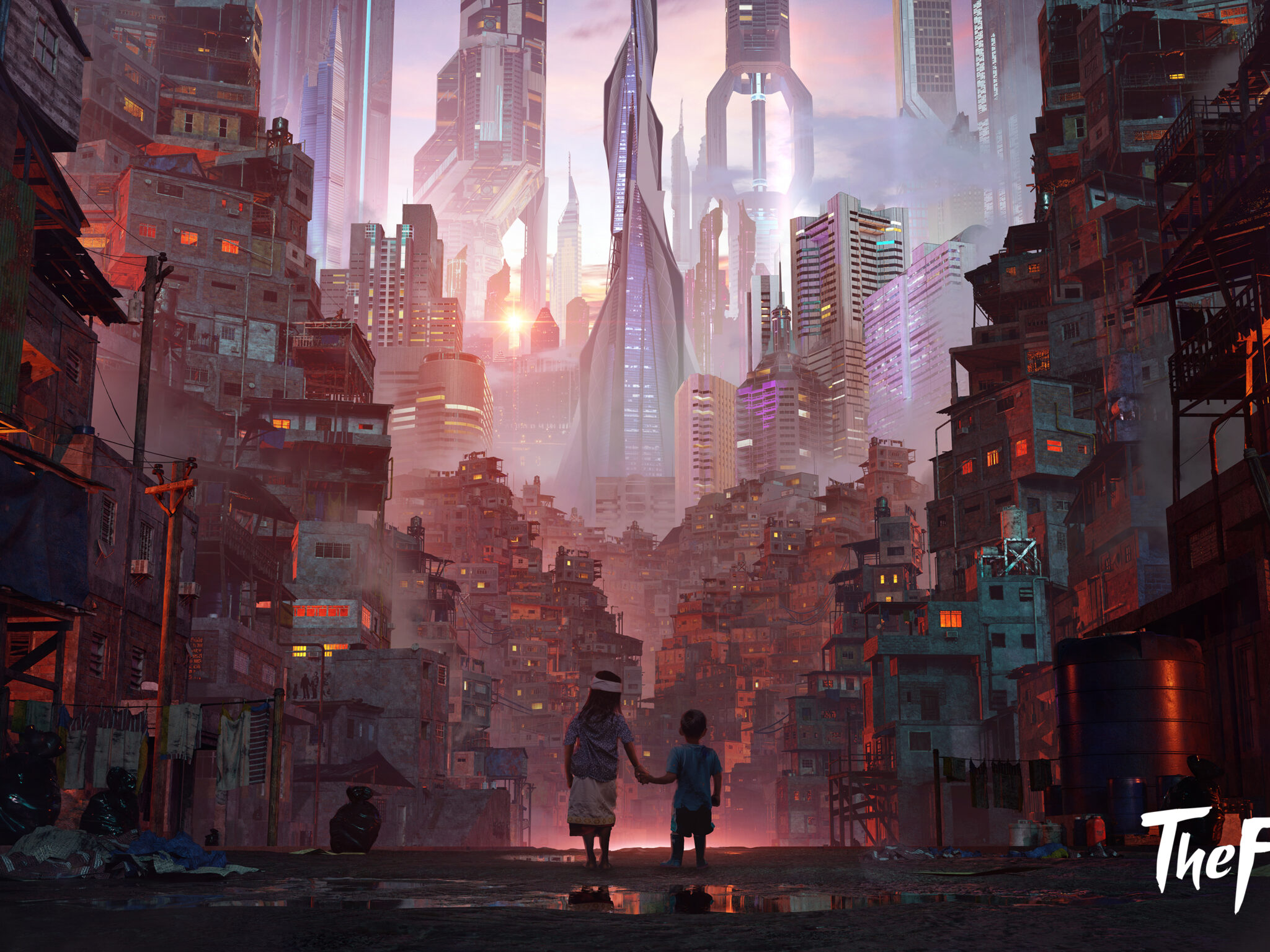 A lone couple walks hand in hand through a dystopian cityscape, with a blend of old and new architecture under a hazy sunset. The contrast o