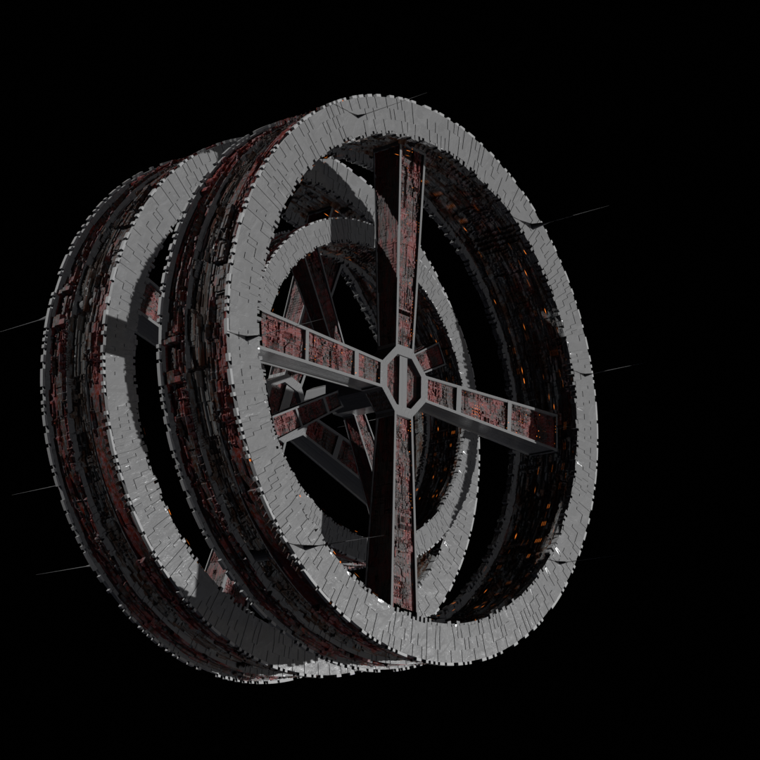 A metallic wheel with four spokes and a central hub, surrounded by concentric rings, set against a black background.