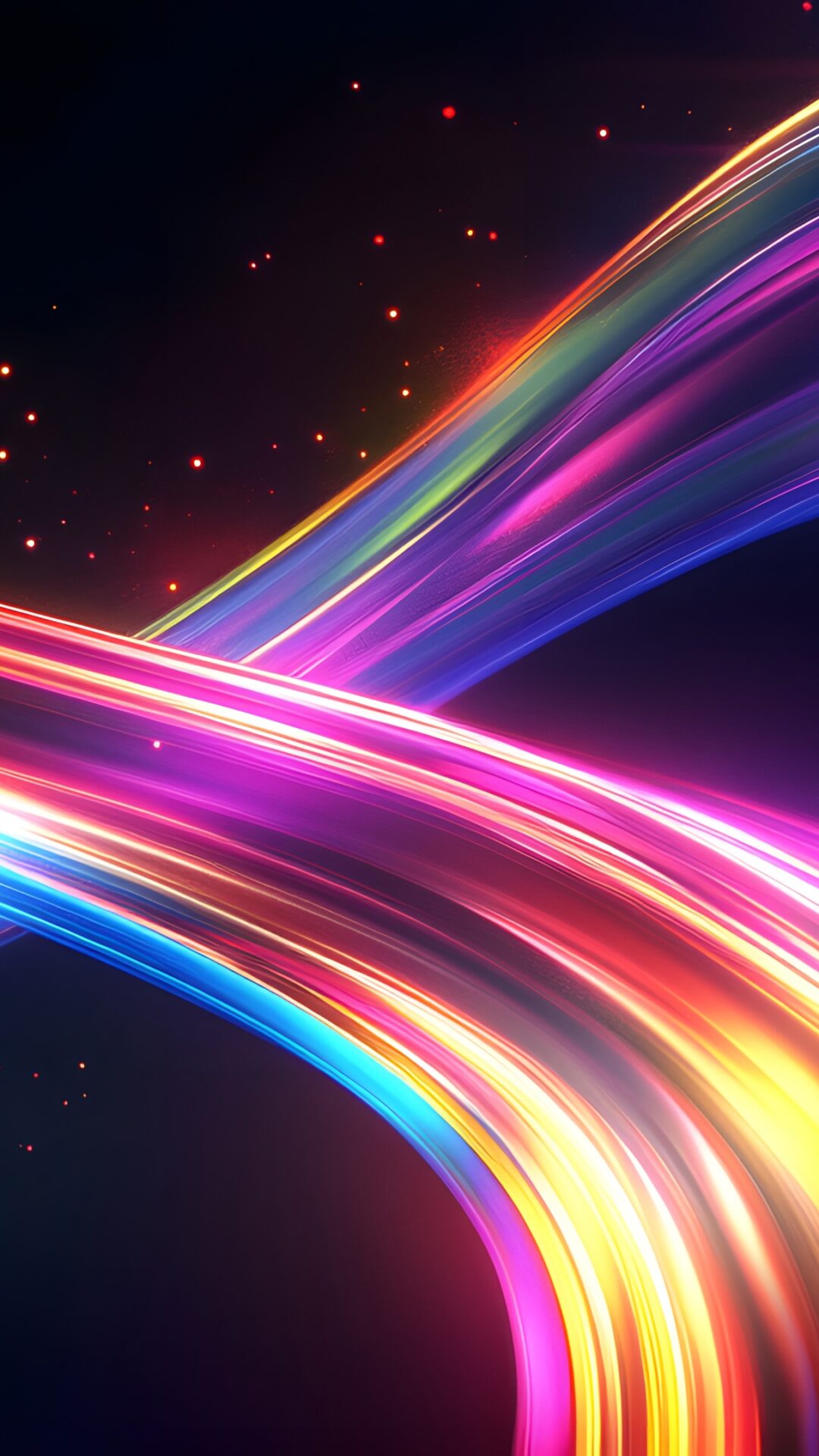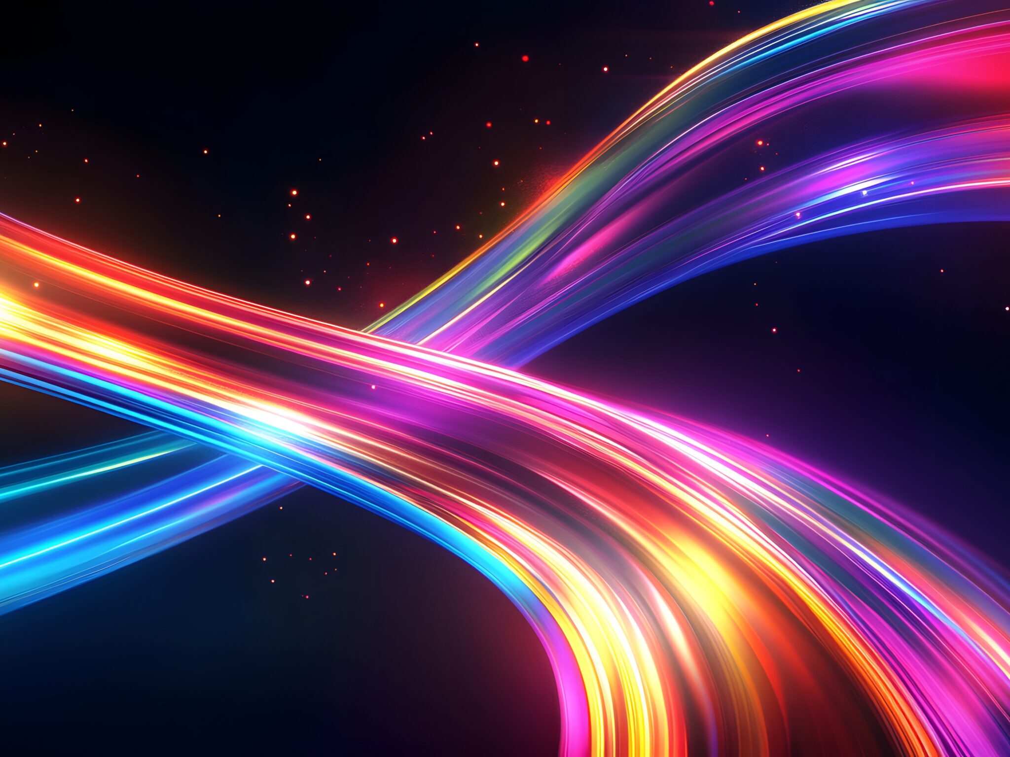 Flowing neon ribbons in cyan, magenta, orange and gold twist and cross against a dark cosmic backdrop with scattered glowing particles. For 4K monitors, this abstract piece brings some serious energy to your desktop.