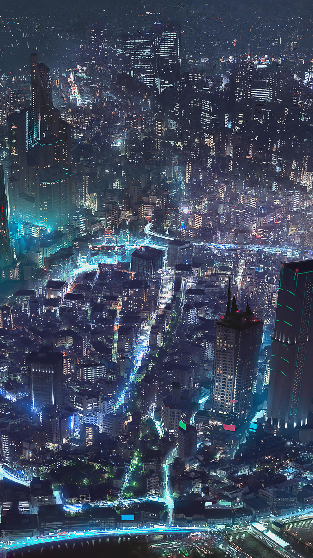 This futuristic cityscape at night, likely inspired by Tokyo's neon-lit streets, features sleek skyscrapers and a vibrant blue glow. It brin