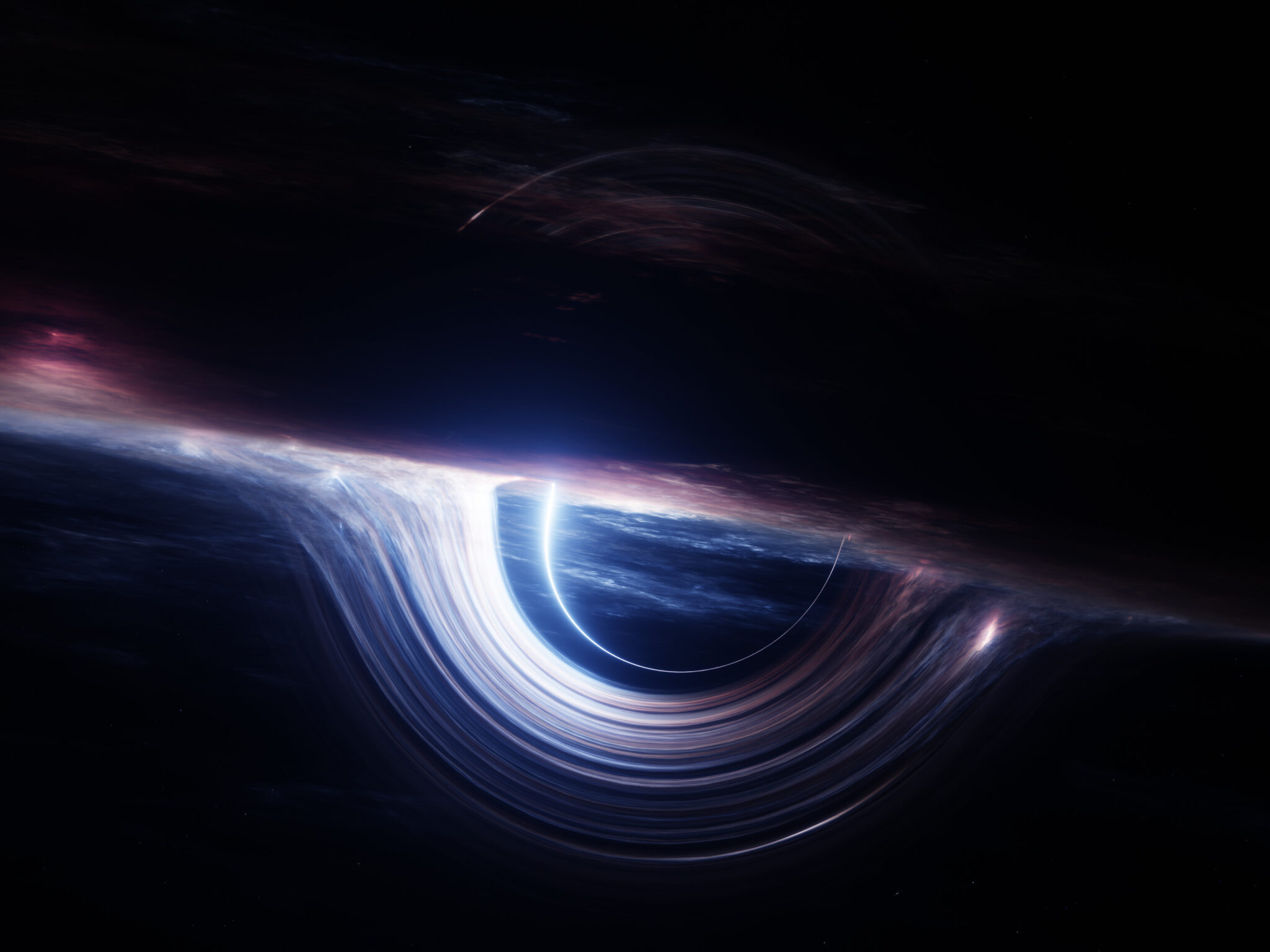 Swirling bands of brilliant white and blue light curve around a dark void, with hints of pink and purple energy dancing through the cosmic distortion. This wallpaper works well for 4K monitors that need some serious sci-fi atmosphere.