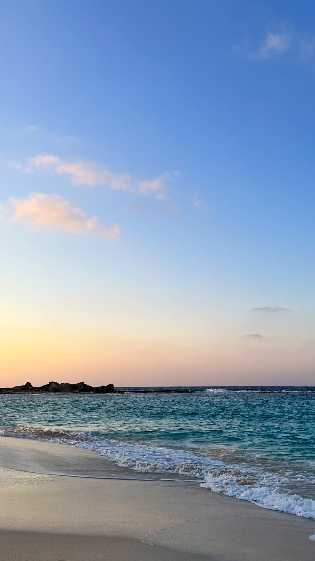 A sandy beach stretches toward a calm turquoise sea under a clear sky. Soft peach and pale blue tones blend across the horizon, creating a s…