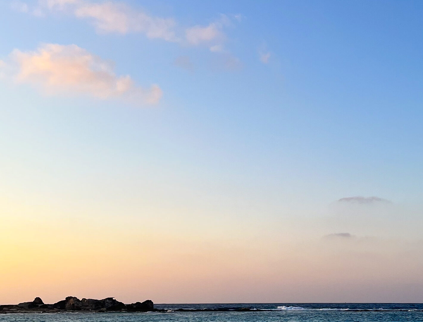 A sandy beach stretches toward a calm turquoise sea under a clear sky. Soft peach and pale blue tones blend across the horizon, creating a smooth gradient effect.