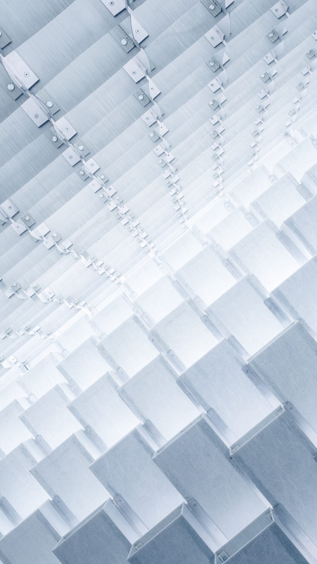 An abstract arrangement of white, angled architectural elements fills the frame. Soft, diffused light creates subtle shadows between the repeating structures and emphasizes depth.