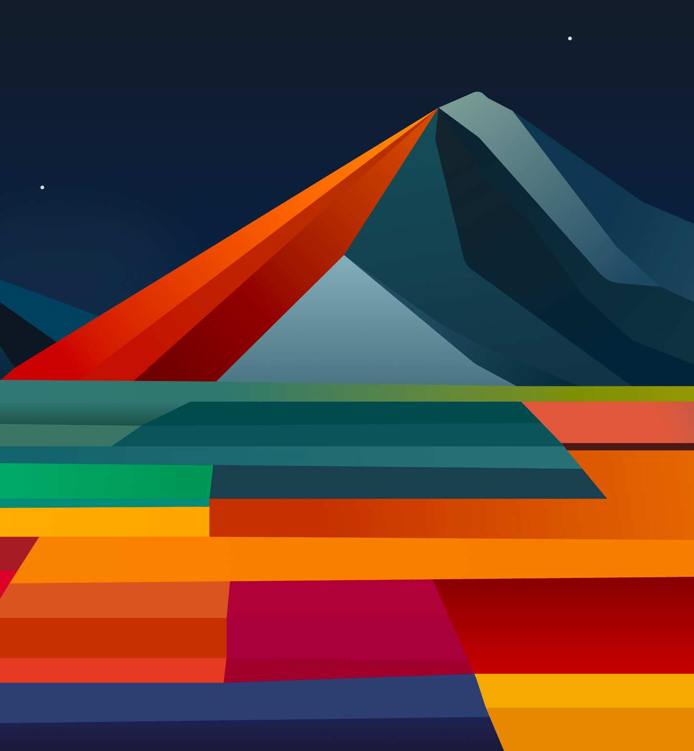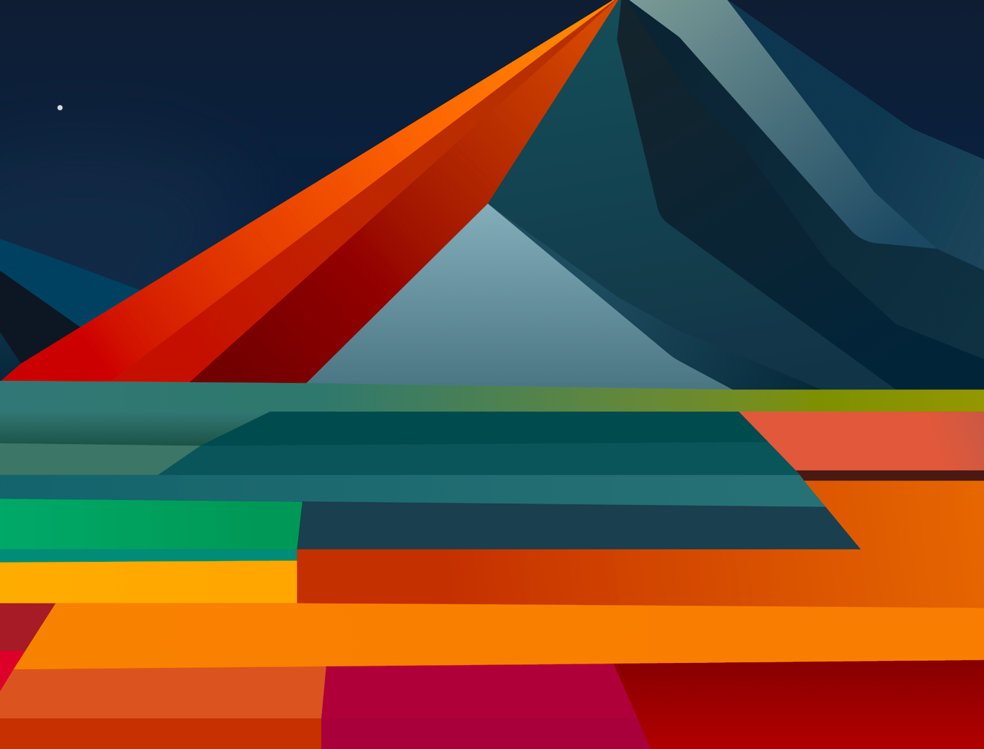 A landscape depicts angular mountains and a foreground constructed from rectangular blocks of color. The flat shapes are rendered in shades of blue, red, orange, and yellow under a dark night sky.