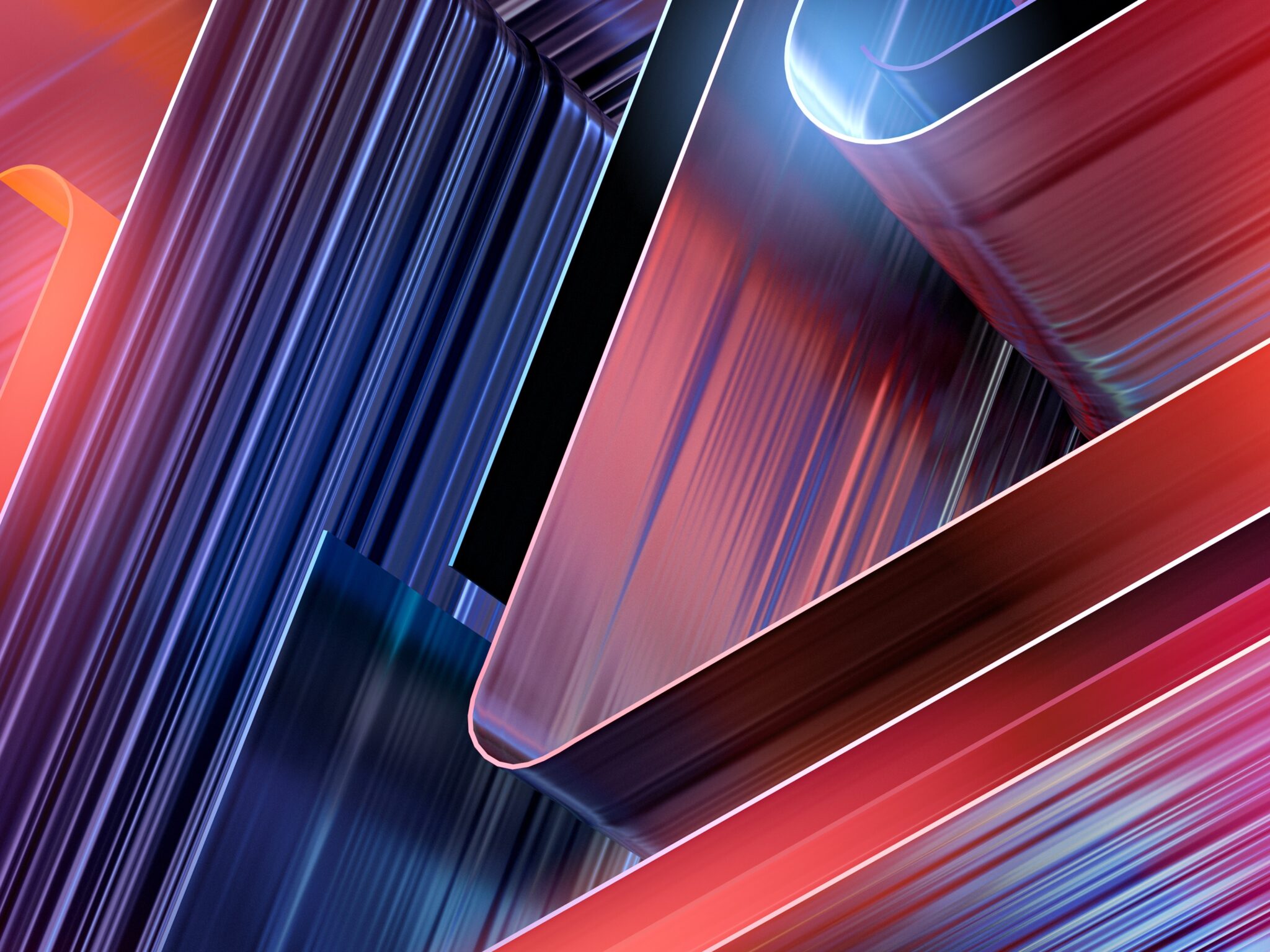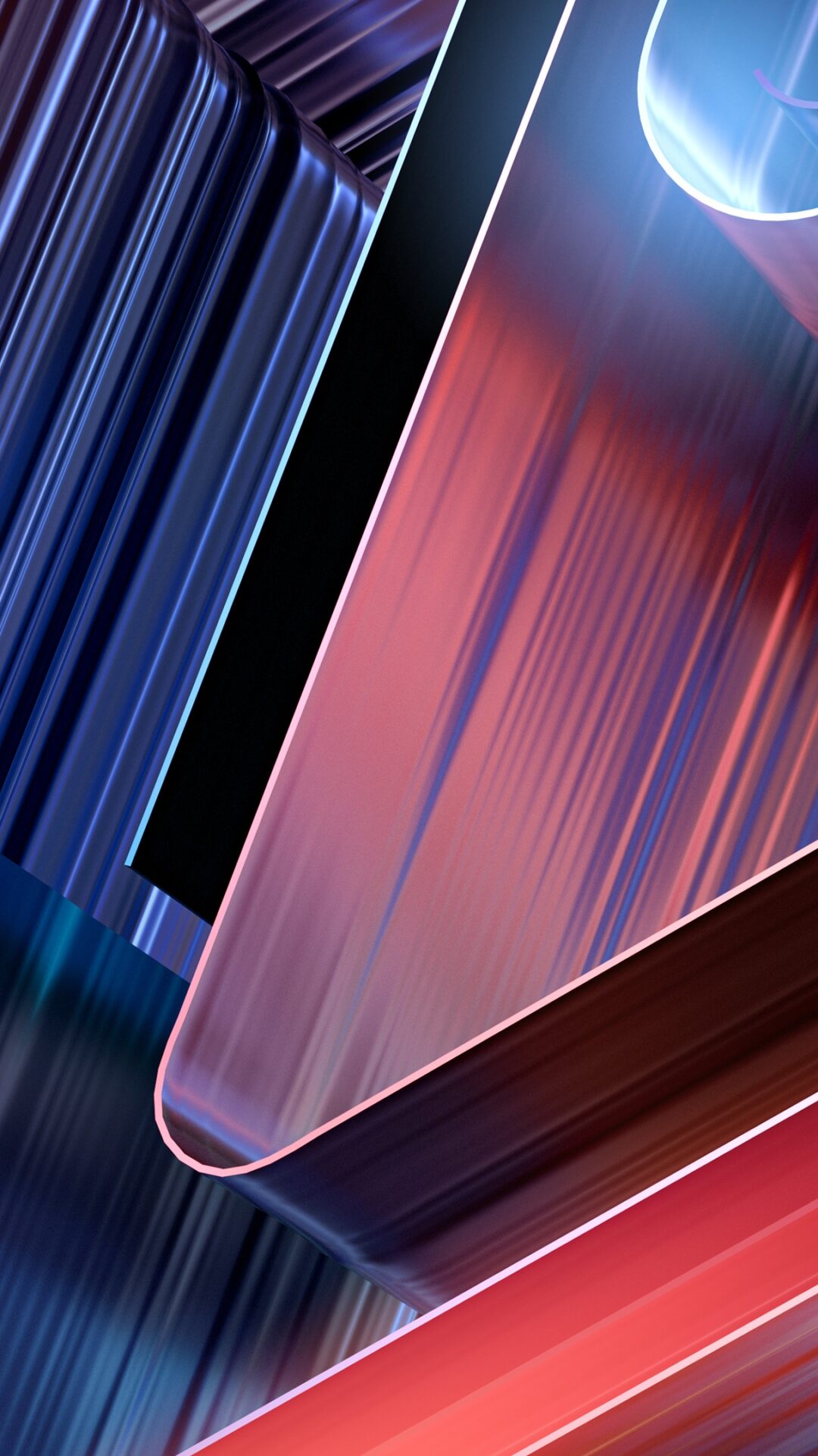 Bold geometric shapes slice through the frame with deep blue, magenta, and coral neon tones creating a sense of speed and dimension. For 4K monitors if you want something abstract and futuristic on your desktop.