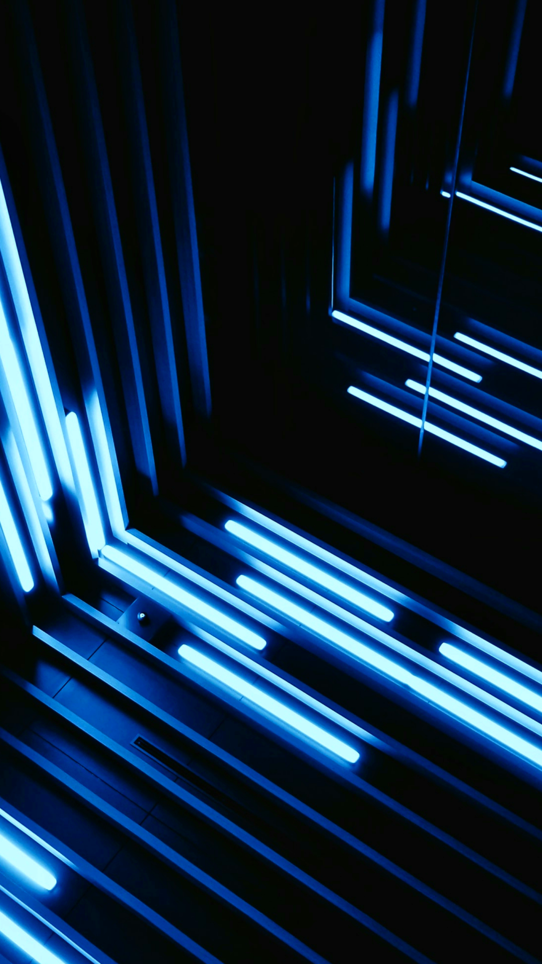 A dark interior is filled with intersecting geometric forms lit by bright blue neon lights. The repetition of lines and sharp angles creates…