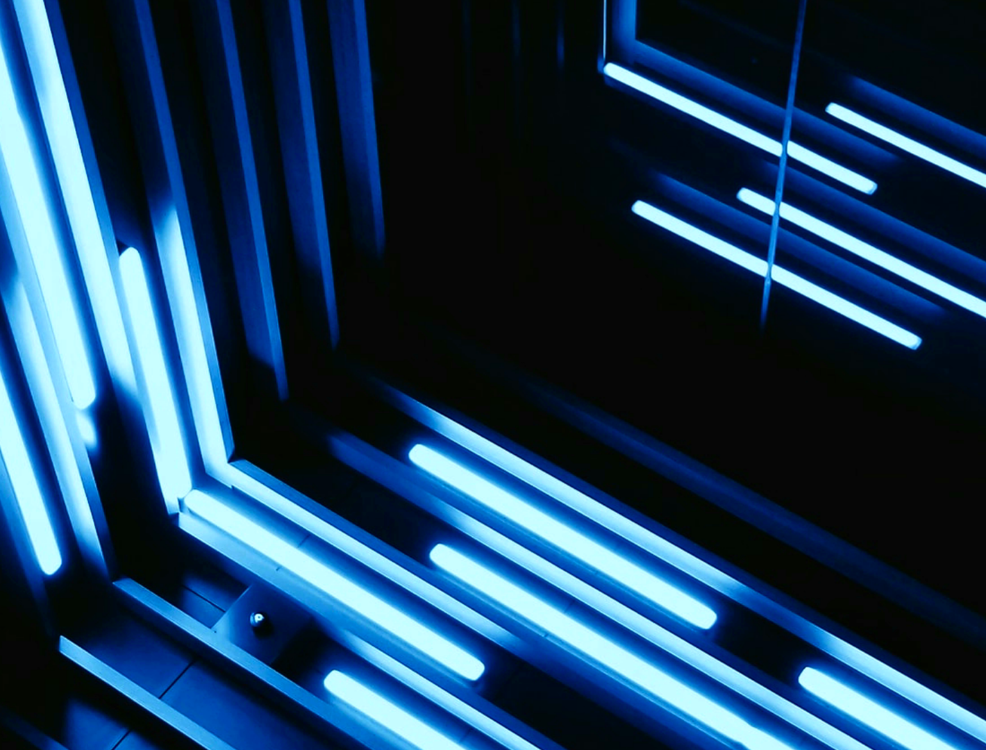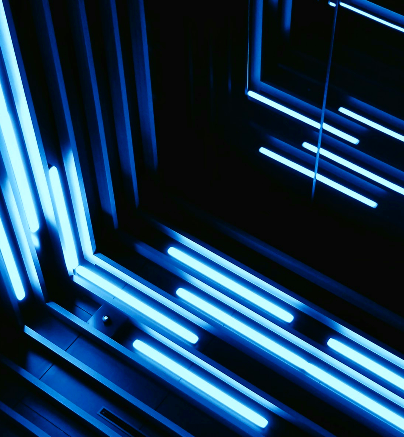 A dark interior is filled with intersecting geometric forms lit by bright blue neon lights. The repetition of lines and sharp angles creates a sense of depth and a cool, artificial glow.