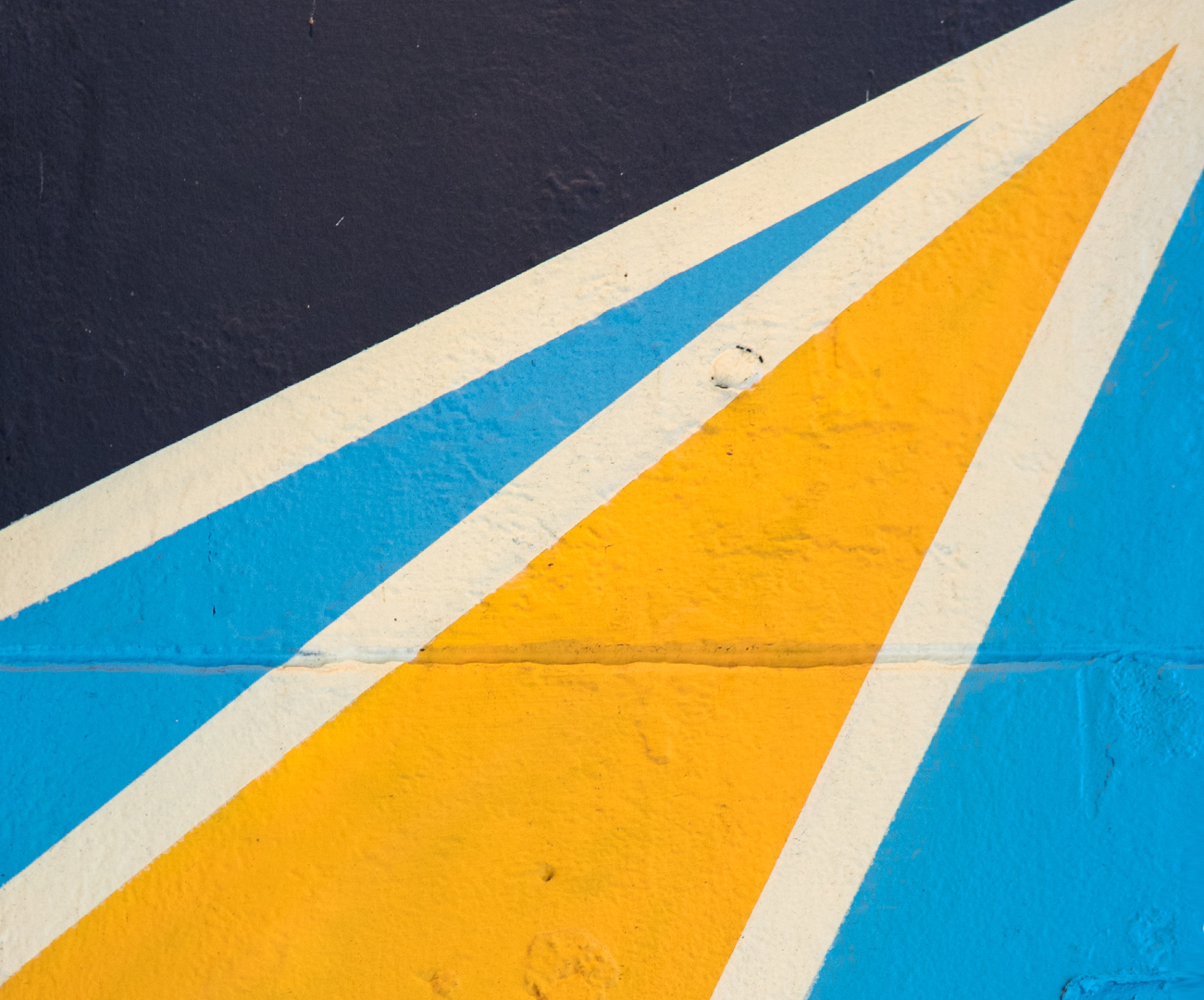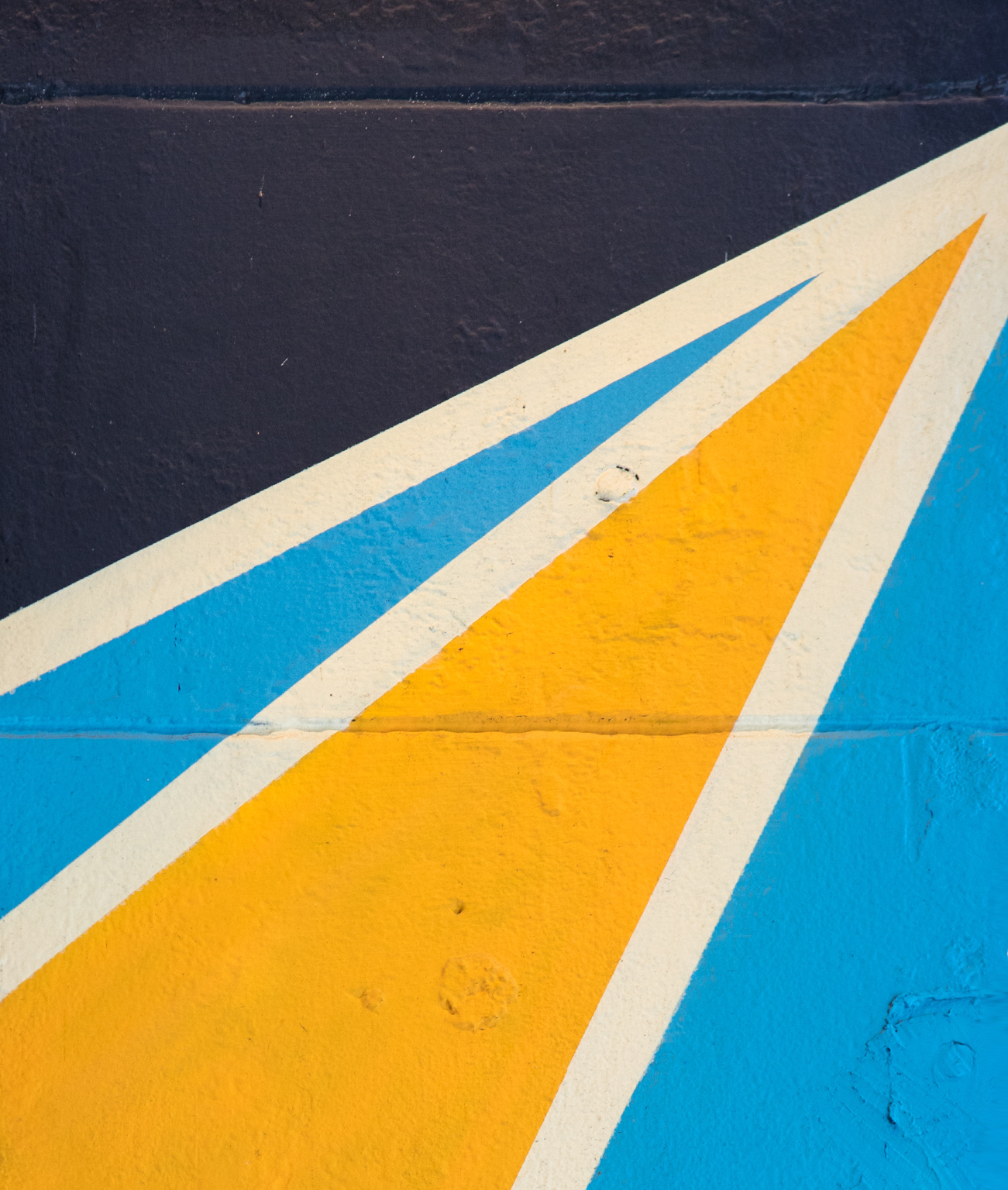 Diagonal stripes of white, yellow, and blue cover a dark surface. The paint has a slightly rough texture, revealing the surface beneath.