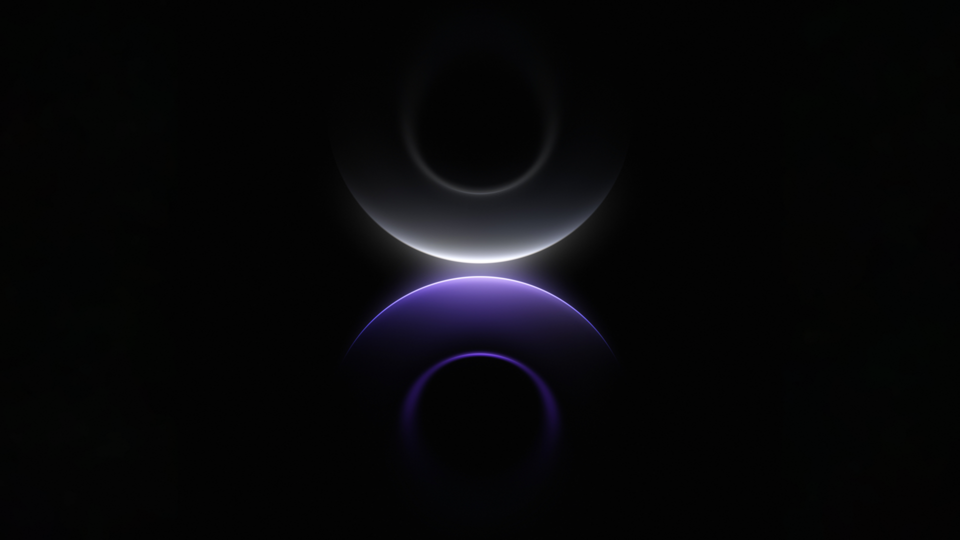 Glowing rings float against a pure black background, with soft white crescents at the top transitioning into deep purple and violet tones be…