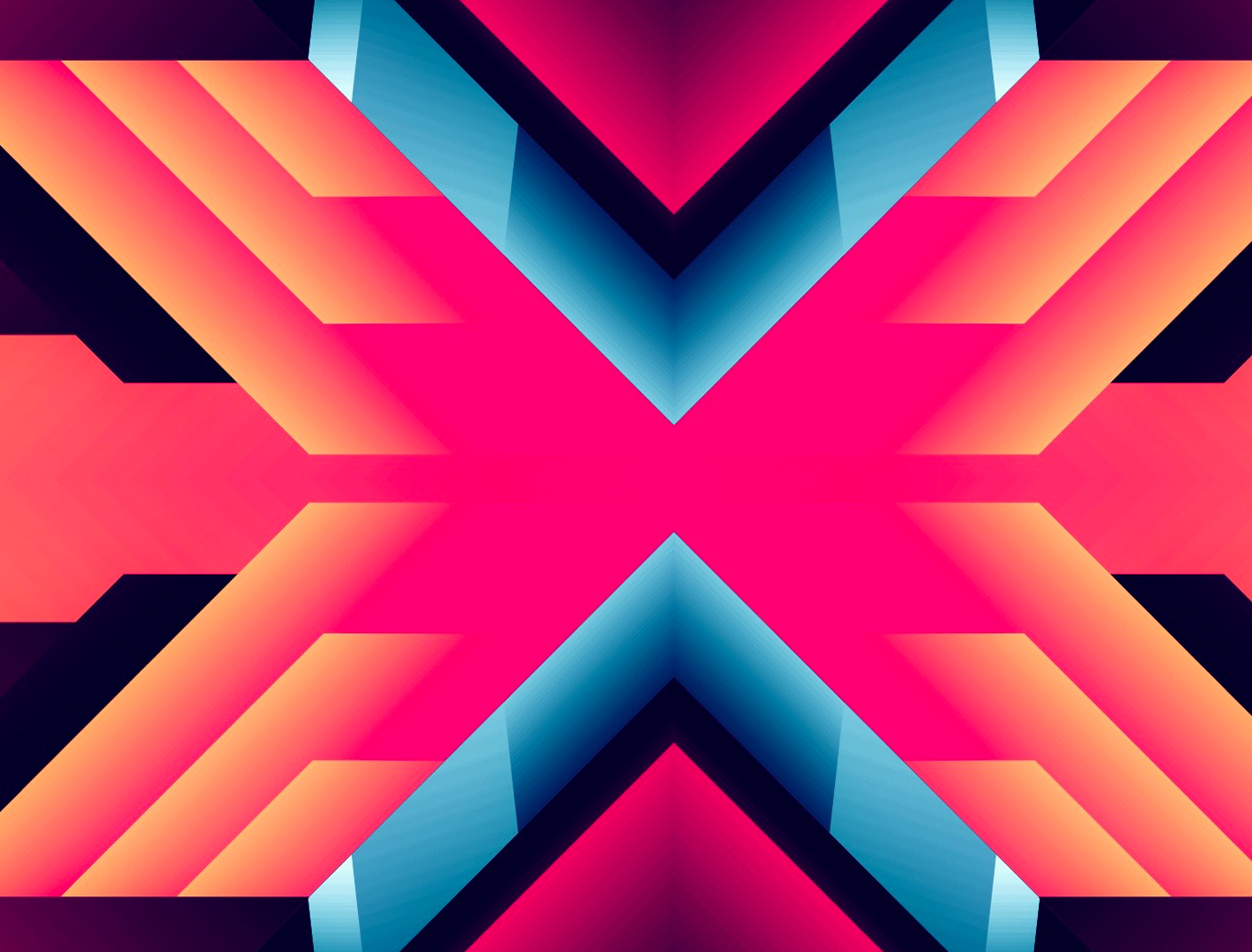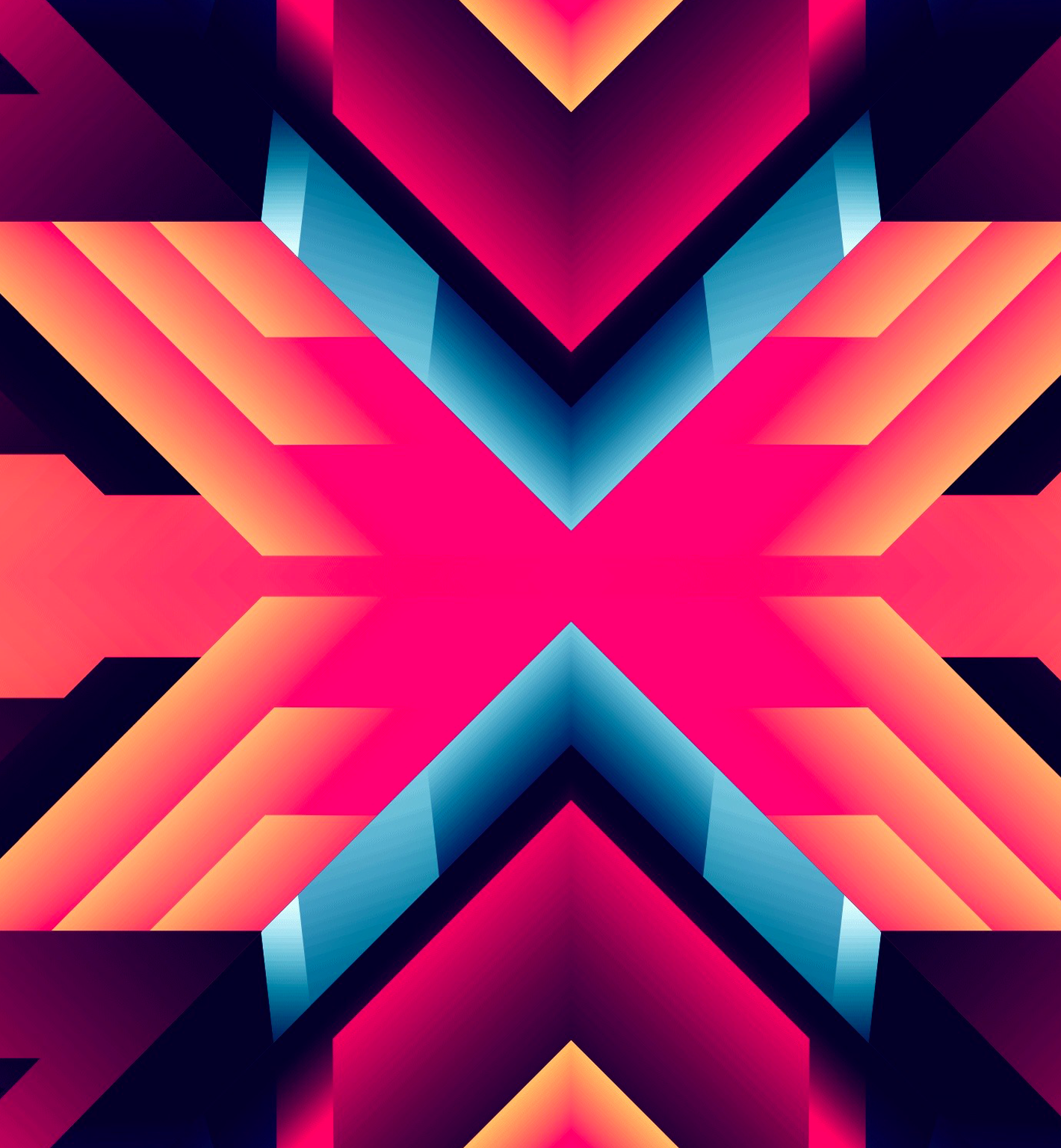A symmetrical arrangement of angular shapes fills the frame with a repeating pattern. Warm orange and magenta tones contrast with cool blue