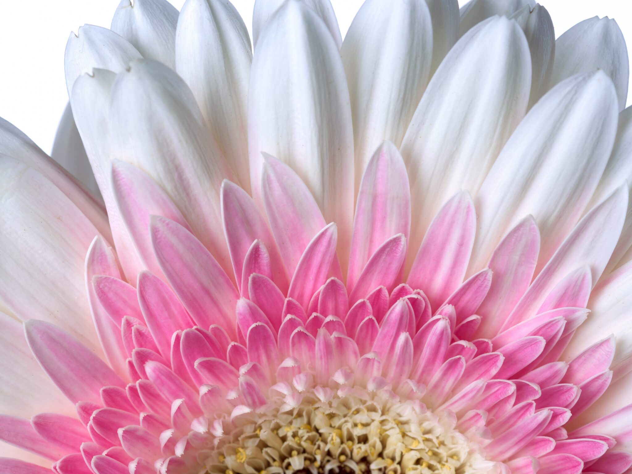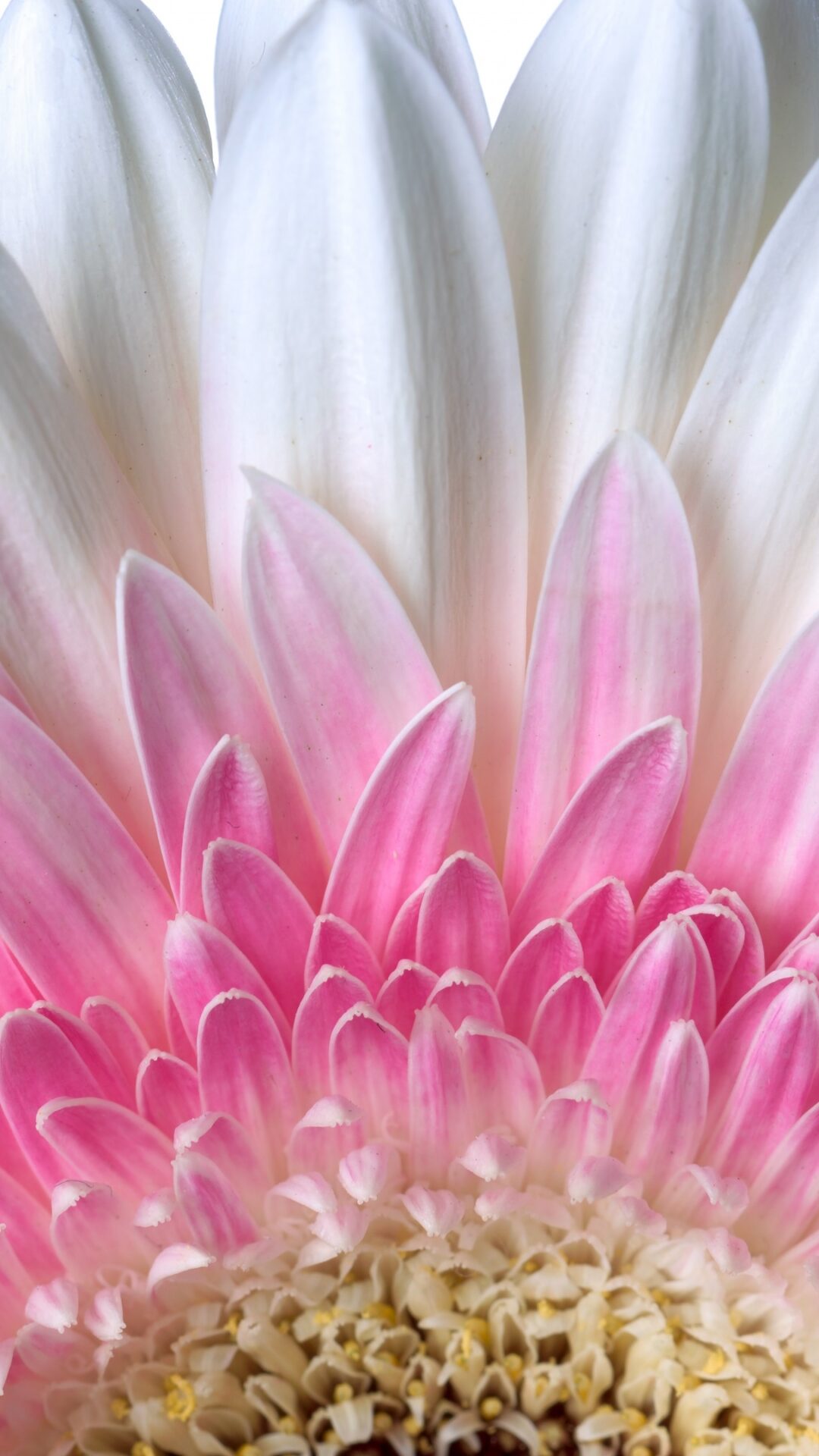 A close-up displays the layered petals of a gerbera daisy, transitioning from white to pink towards the center. The flower's texture shows fine ridges and a golden yellow pollen-covered core.